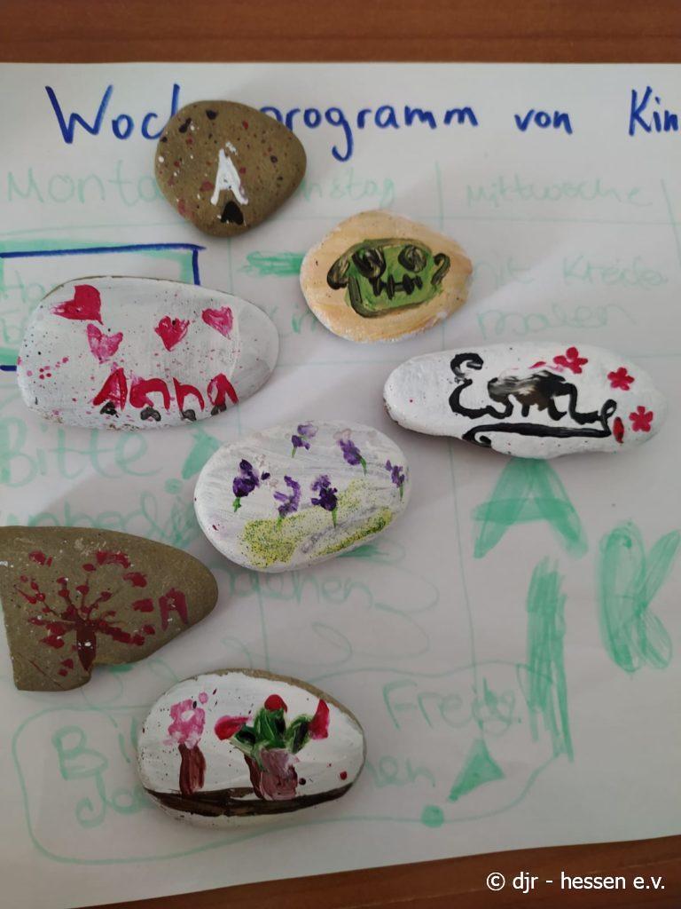 Wieso sollte man sich nur auf Papier beschränken, wenn man auch andere Materialien wie Steine bemalen kann? Die Kinder haben jedenfalls auch hier ihrer Kreativität freien Lauf gelassen. Entstanden sind total süße Steine, von denen keiner dem anderen gleicht.