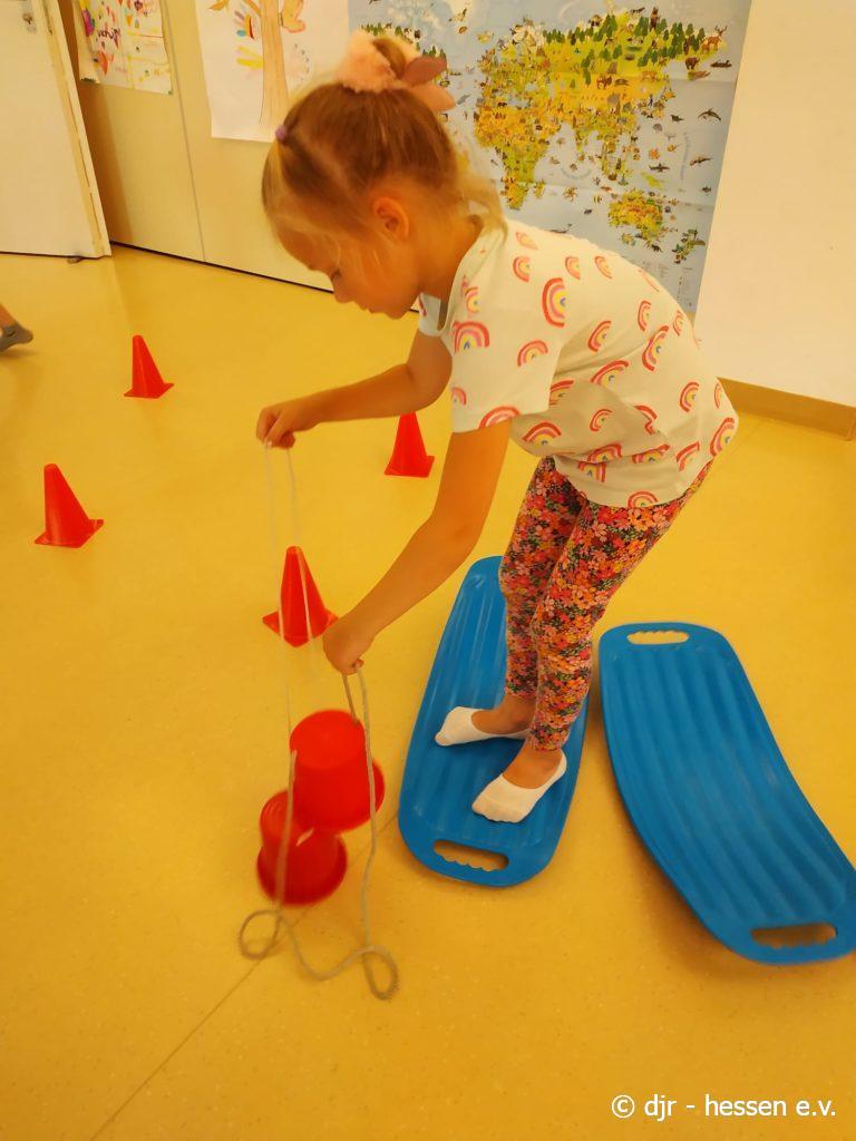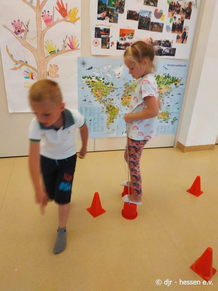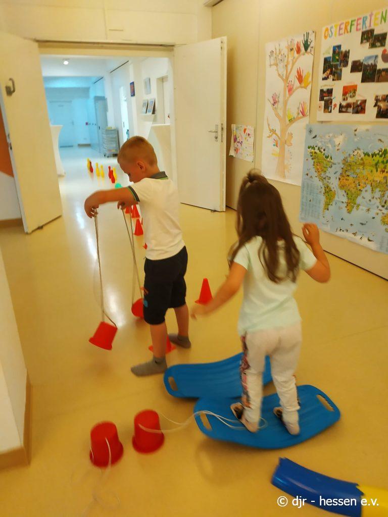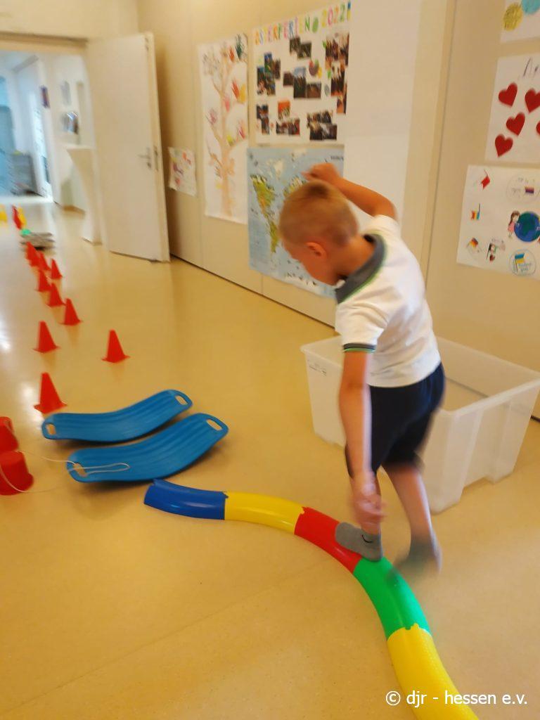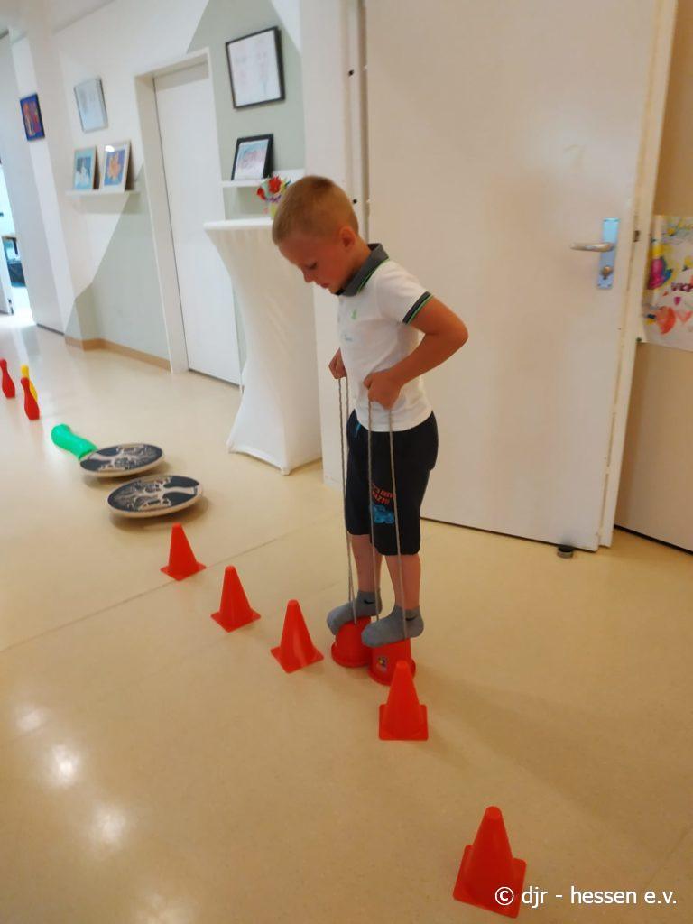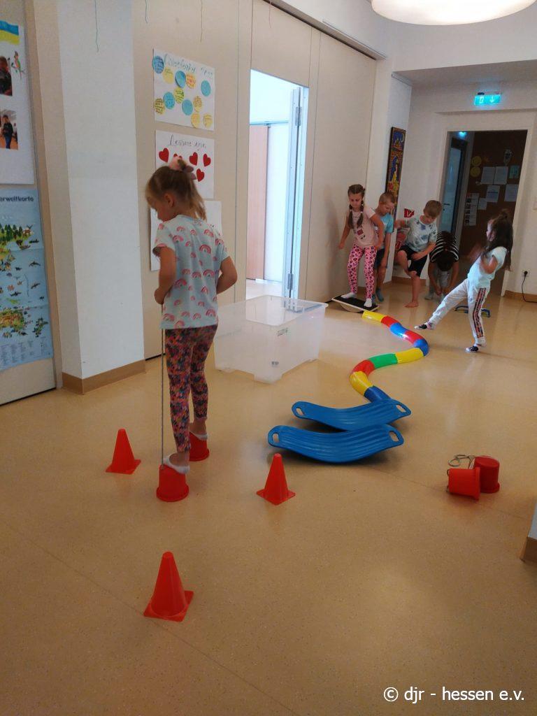 Nicht nur draußen kann man sich sportlich beteiligen; gerade bei der Hitze lässt sich auch in den Räumlichkeiten einiges unternehmen. Bewegung, Gleichgewichtssinn und Kreativität sind gefragt, um diese Parcours zu bewältigen.