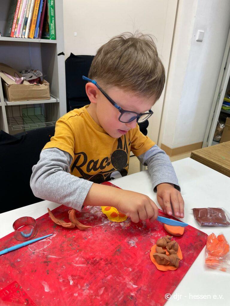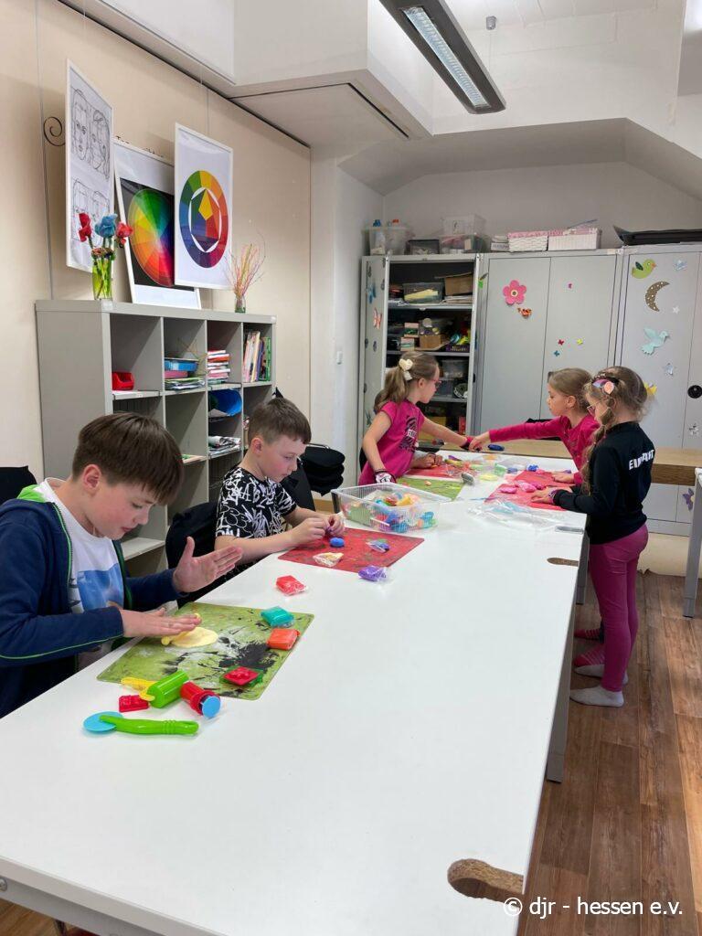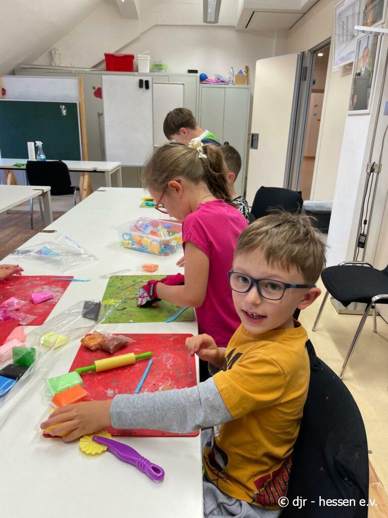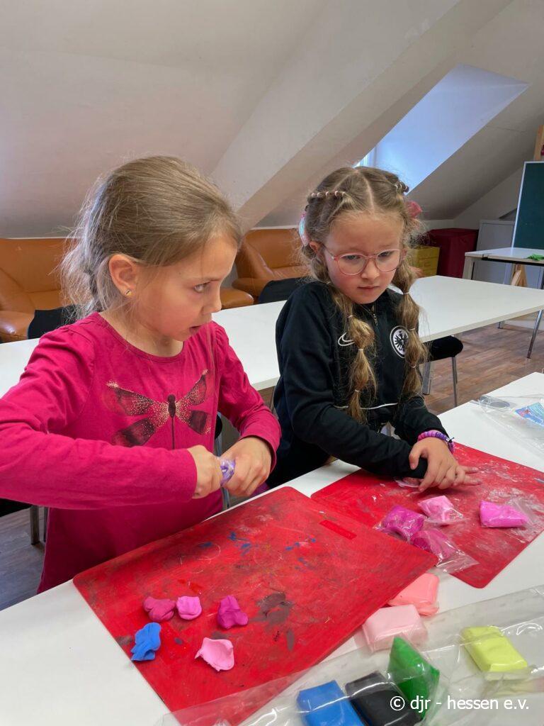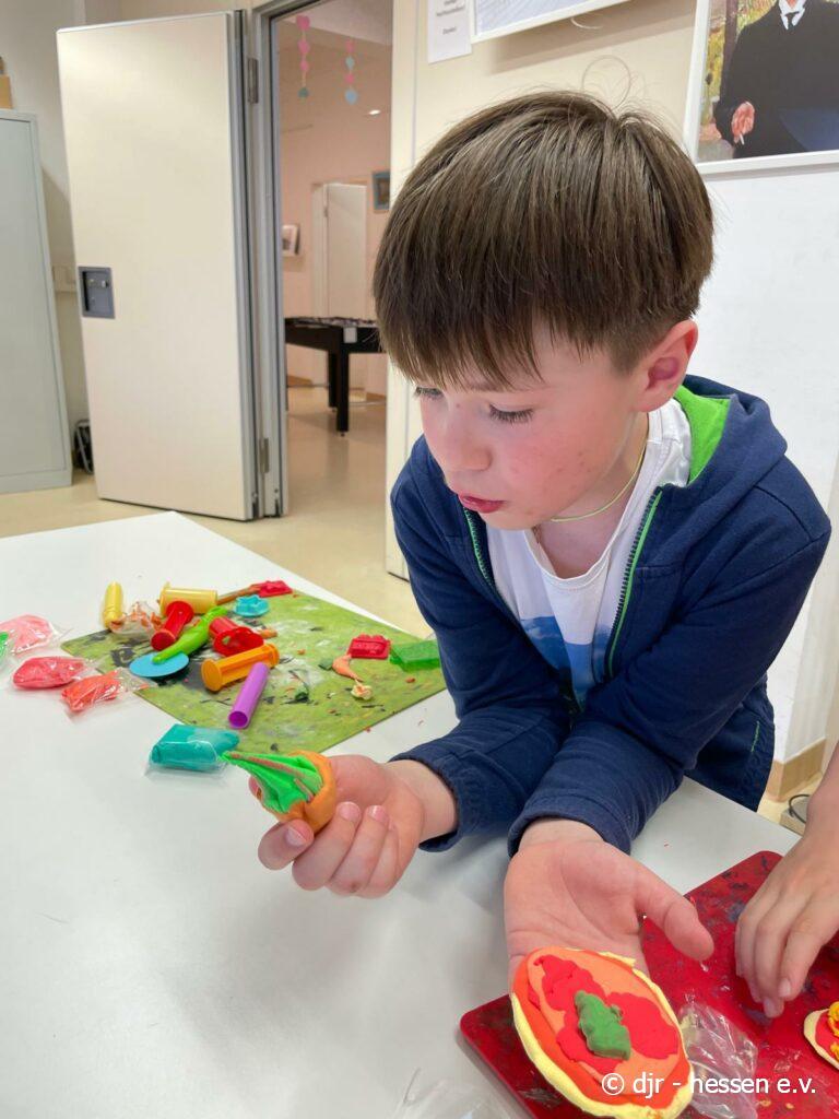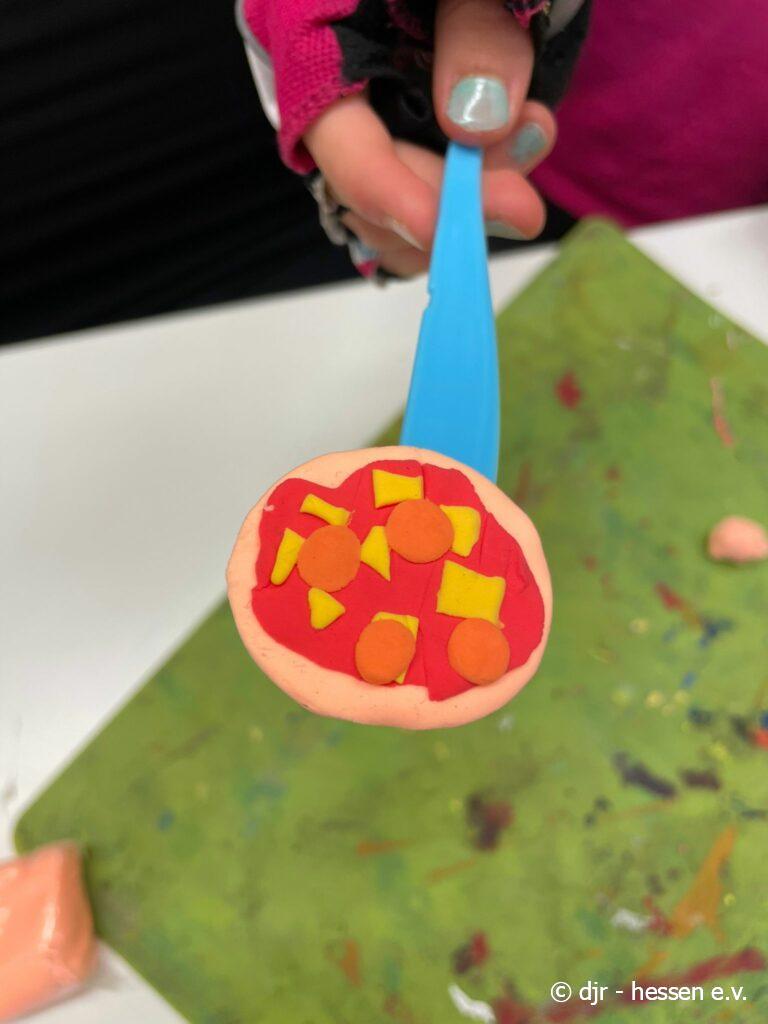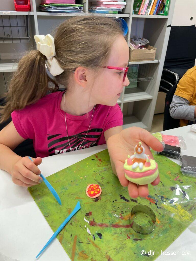 Die Kinder nutzen heute lufttrocknendes Fimo und stellen vielfältige Kunstwerke her. Ein beliebtes Thema heute waren verschiedene Leckereien, die durch das bunte Fimo besonders lebensecht aussehen.