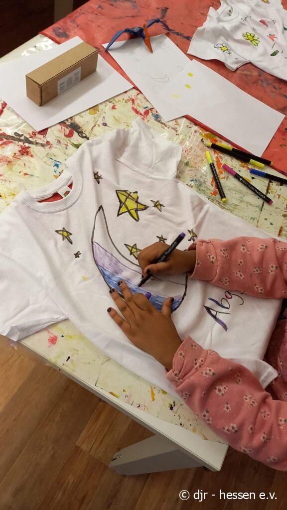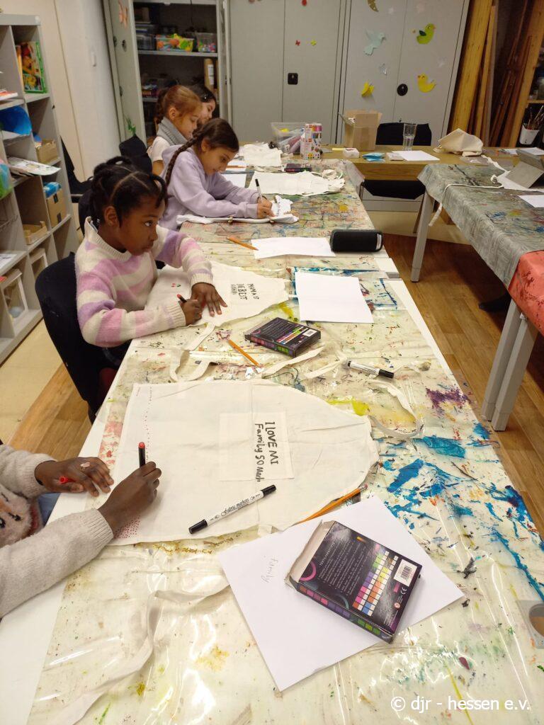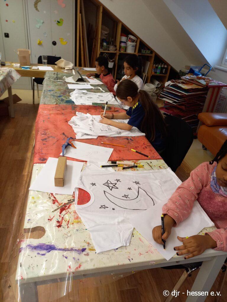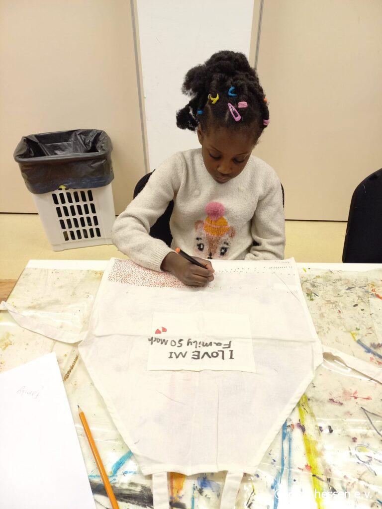 Die Kinder haben Spaß dabei, Verschiedenes aus Stoff zu bemalen. T-Shirts, Schürzen, Mäppchen: Für alle ist etwas dabei, was einzigartig gestaltet werden kann.