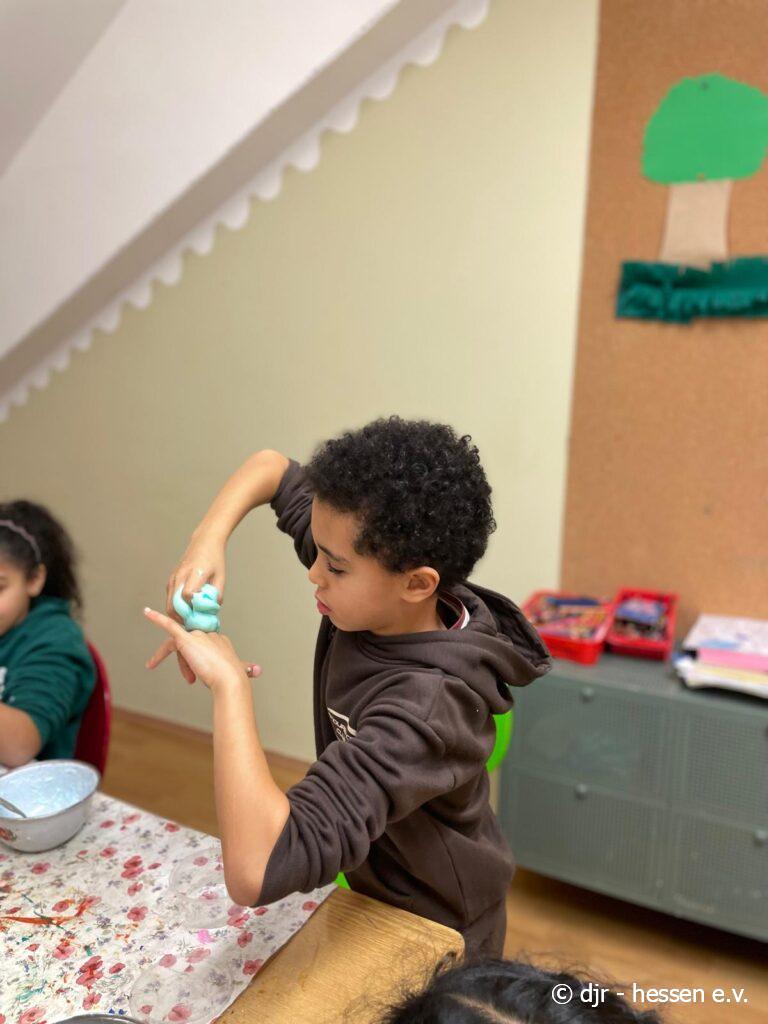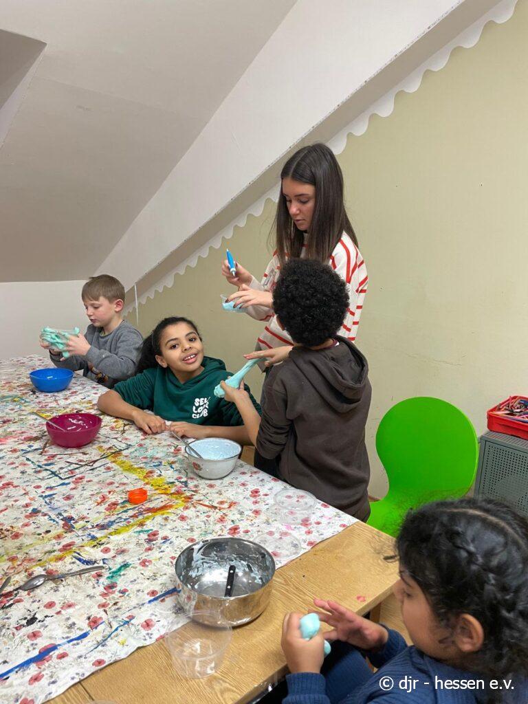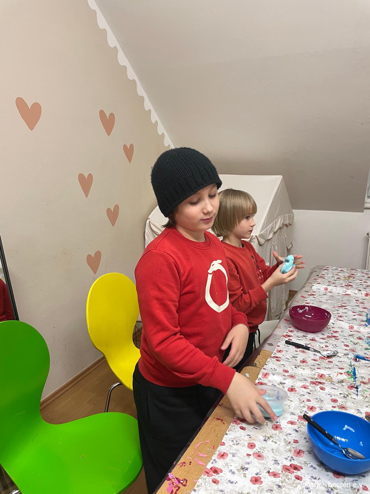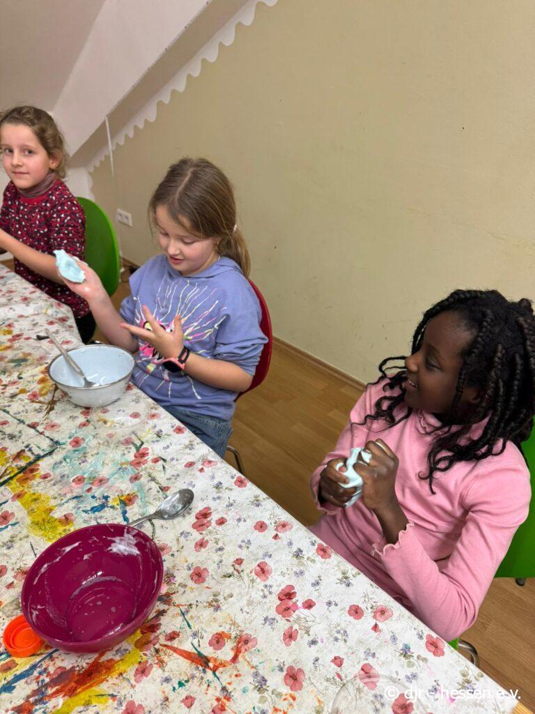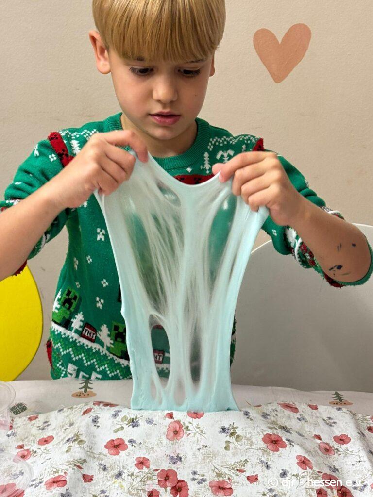 Mit großer Freude stellen die Kinder ihren eigenen Slime her, mit dem sie schließlich nach Lust und Laune spielen.