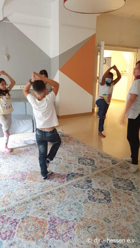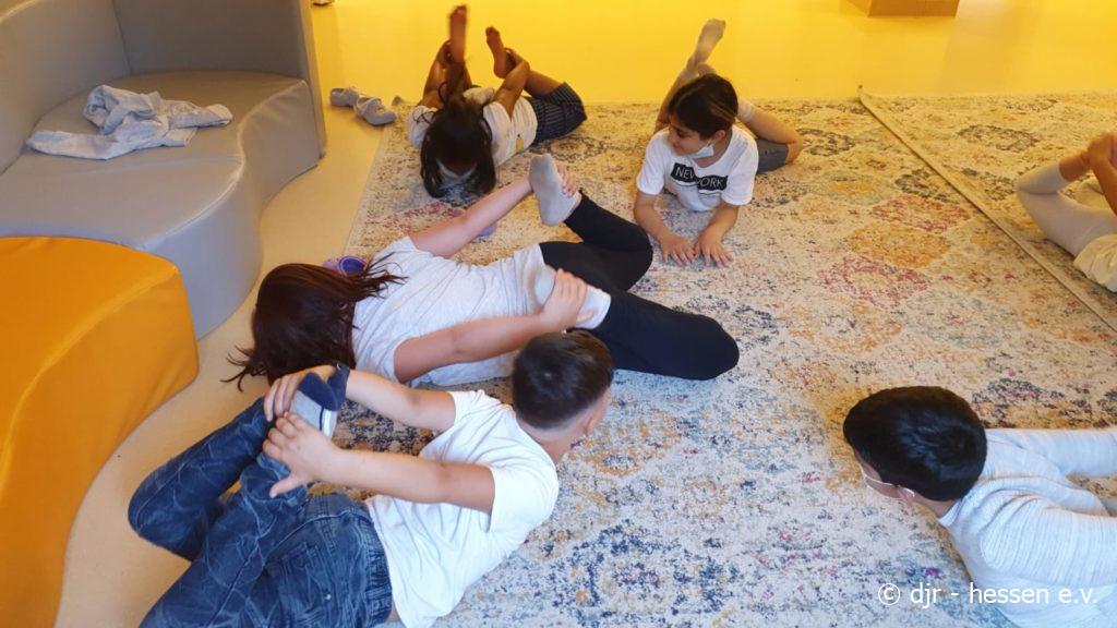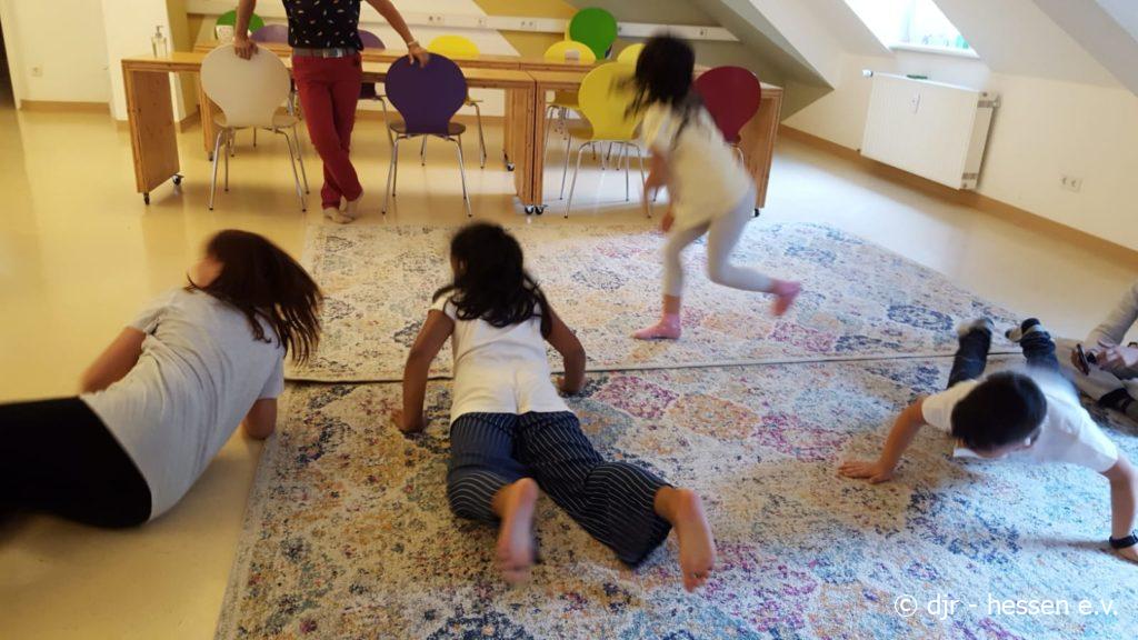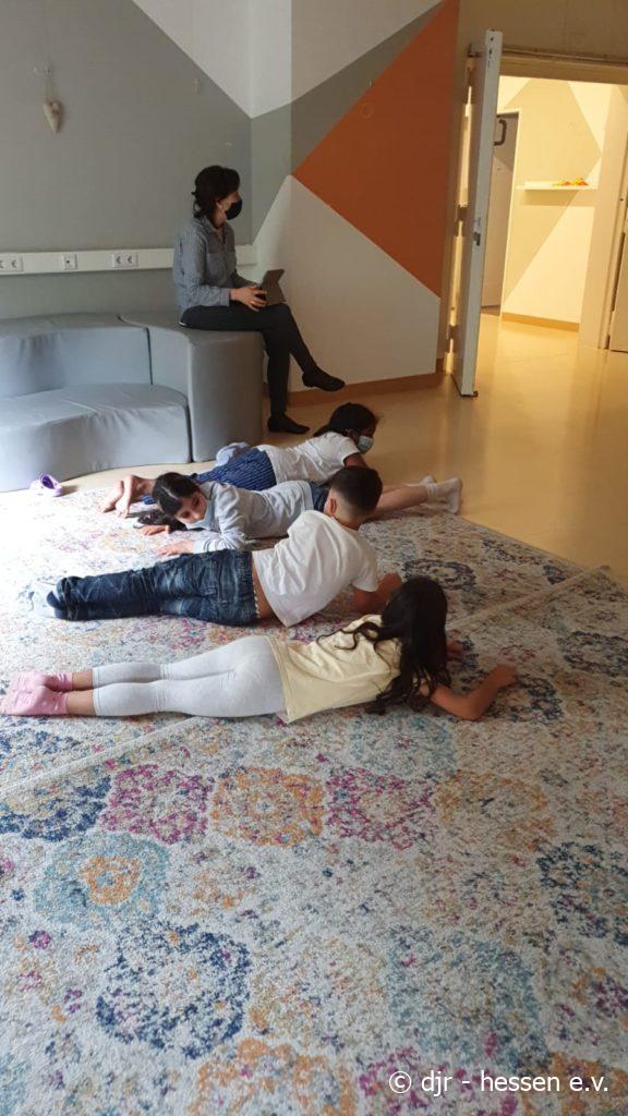 Auch, wenn man nicht immer raus gehen kann: Bewegung zwischendurch ist immer richtig und wichtig. Jedes Kind sucht sich eine Sportübung aus, die anderen Kinder machen nach. So bewegen wir uns im Team und haben dabei Spaß!
