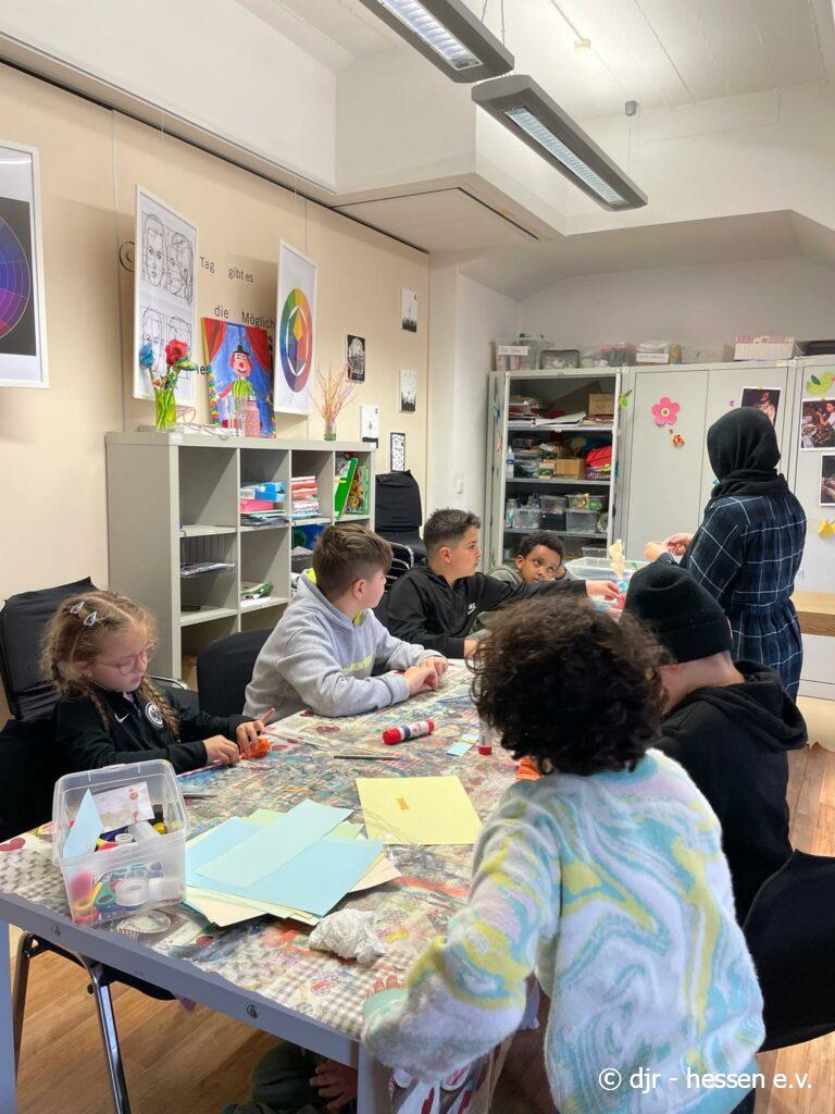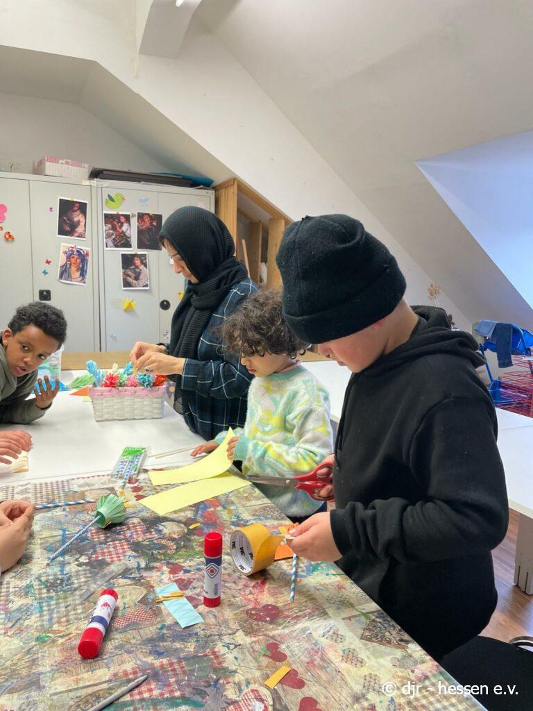Die Kinder basteln für den 8. März Blumen, die sie am Frauentag an Frauen aus der Nachbarschaft verteilen. So können sie ihren Mitmenschen eine Freude bereiten.