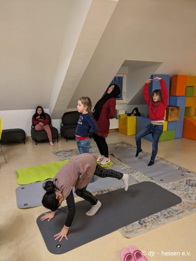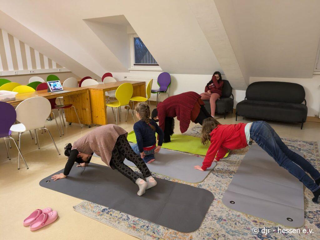 Der Alltag der Kinder besteht oftmals aus langem Still-Sitzen. Deswegen ist ausgleichende Bewegung gerade in dem Alter wichtig. Gemeinsam stellen sich die Kinder auf die Yogamatten und probieren verschiedenste Dehn- und Streckübungen aus. So bekommt man auch nach langem Sitzen wieder ein Gefühl für den Körper.