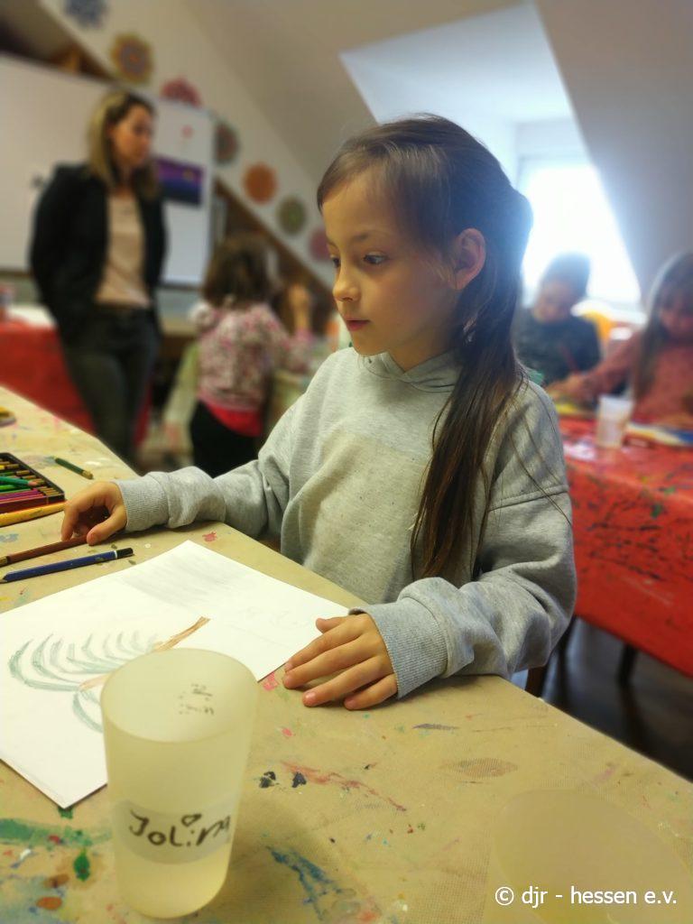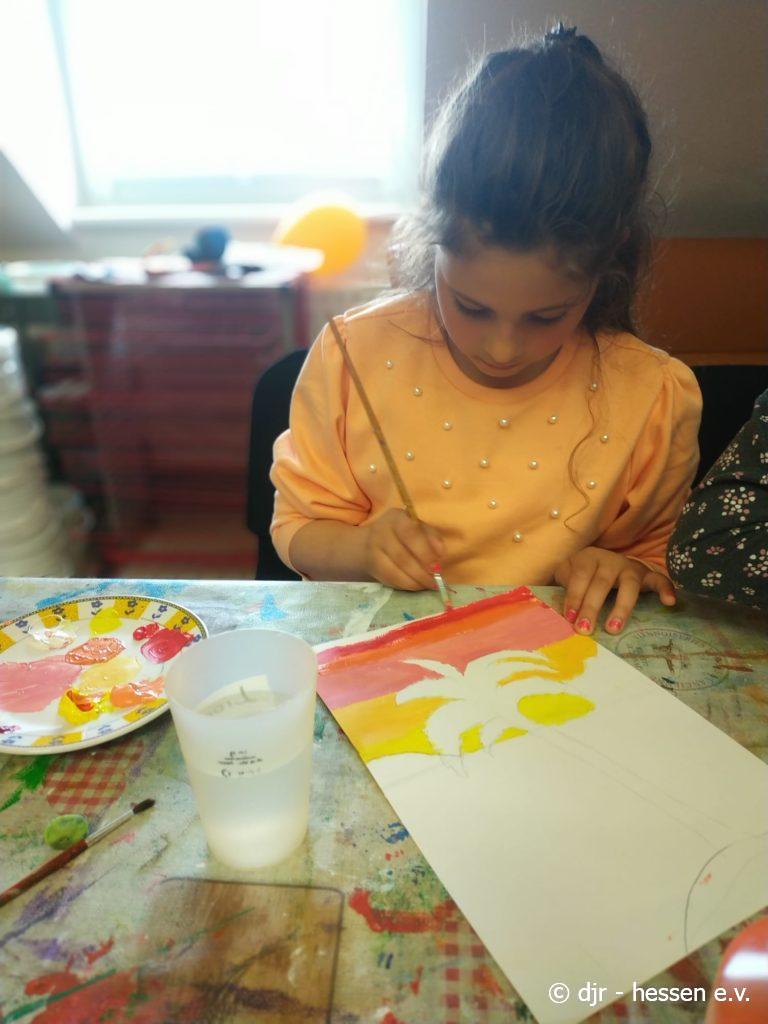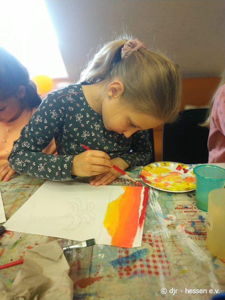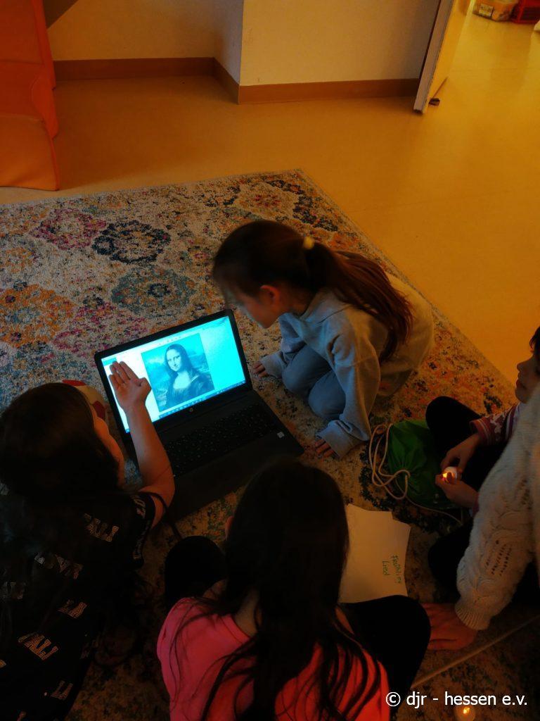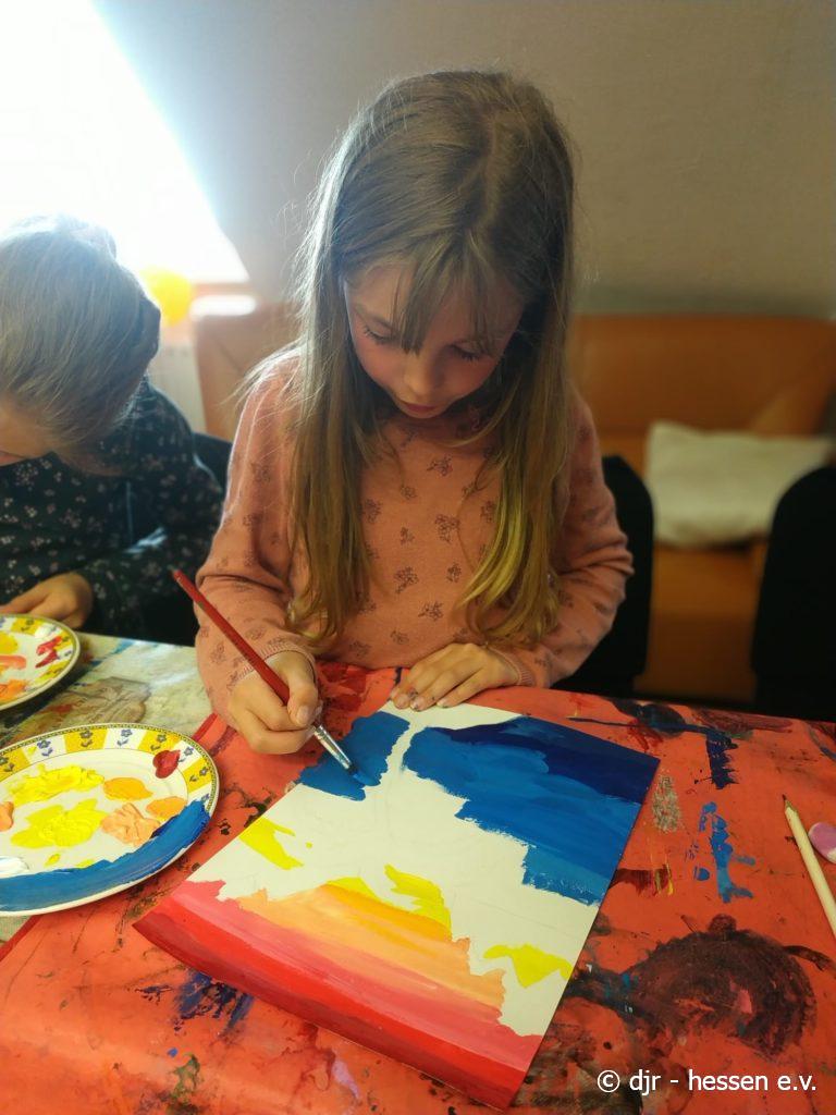 Heute beschäftigen wir uns mit Kunst. Nach der Mal-AG, in der die Kinder schöne Himmel gemalt haben, lernen sie im Kreis Einiges über berühmte Gemälde kennen. Durch die Verbindung von Theorie und Praxis bleibt dieser Tag bei den Kindern besonders gut im Kopf.