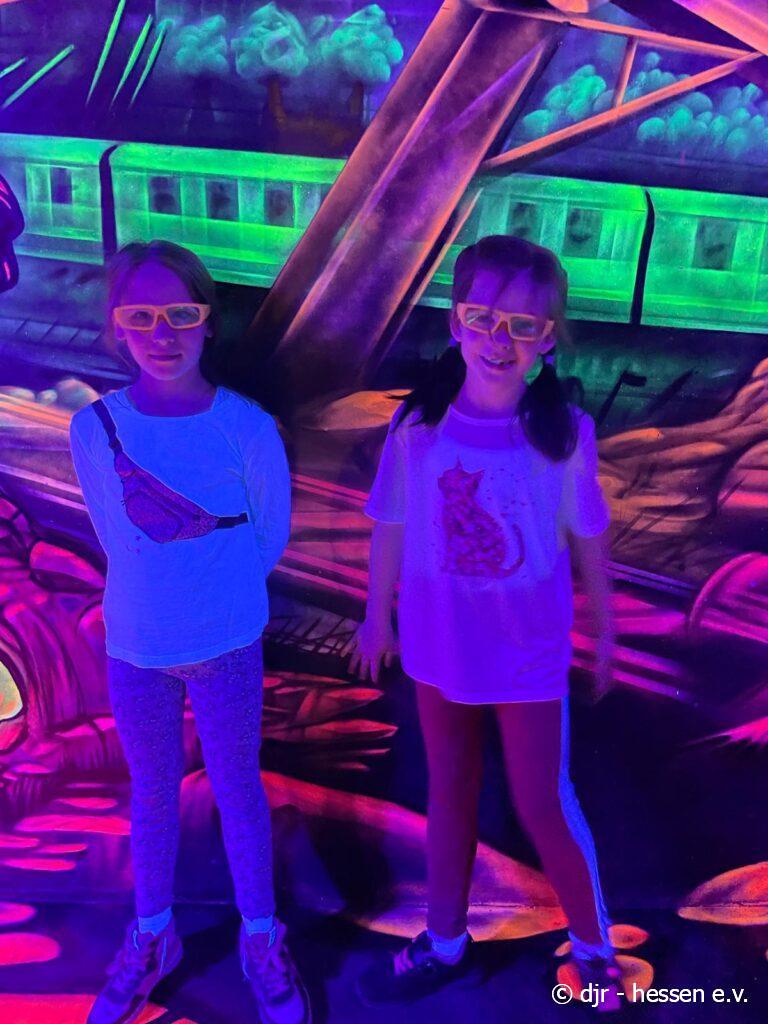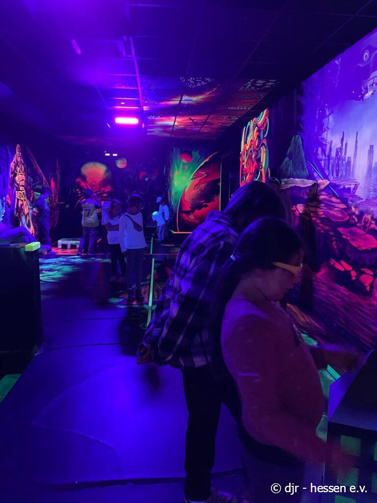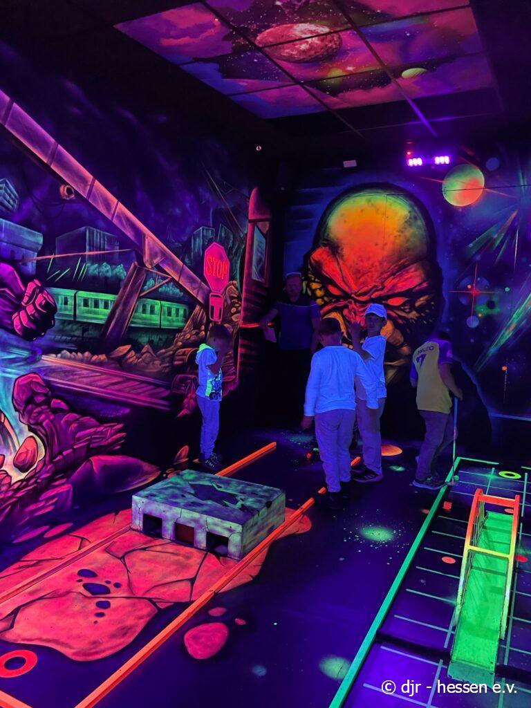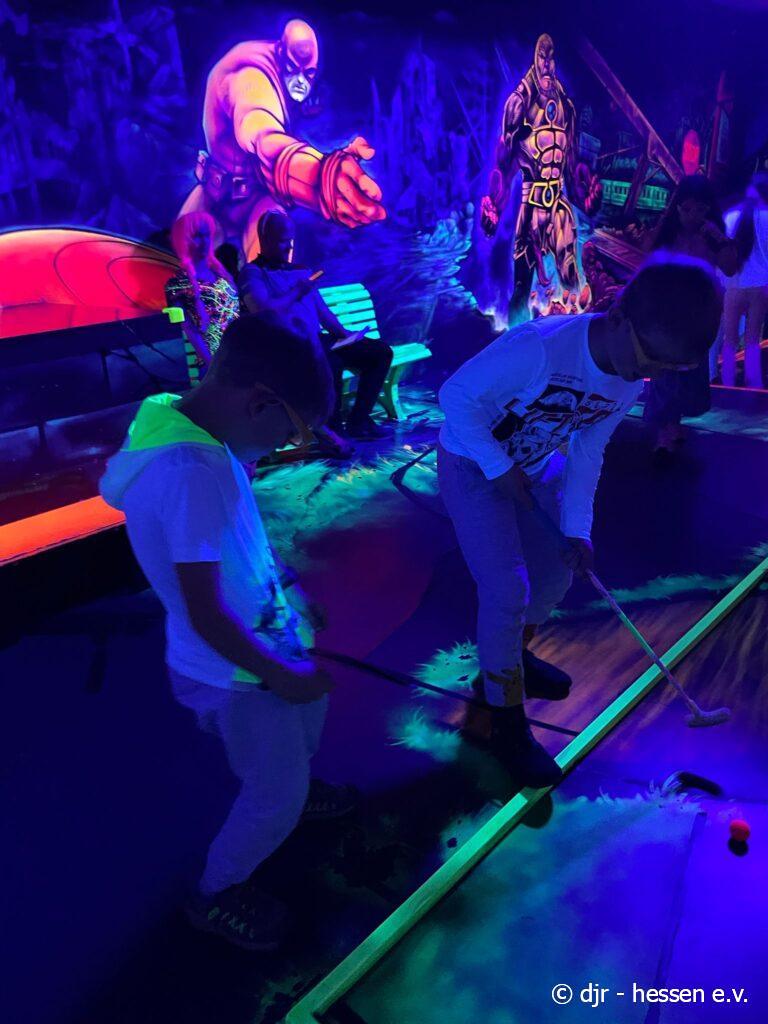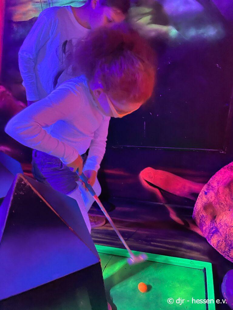 Beim Schwarzlichtminigolf können die Kinder auf den schrill-leuchtenden Bahnen ihr Geschick beweisen. Wer ist am zielsichersten und bringt den Ball am schnellsten ins Loch?