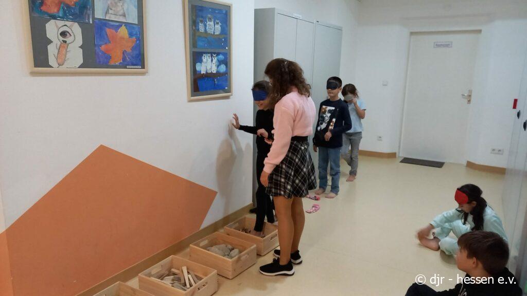 Heute ist der Tastsinn der Kinder gefragt: gemeinsam meistern sie den Barfußpfad. Besonders schwierig ist dabei, die Naturmaterialien, die man erfühlt, zu benennen. Mit viel Konzentration und Gefühl schaffen die Kinder auch diese Aufgabe.