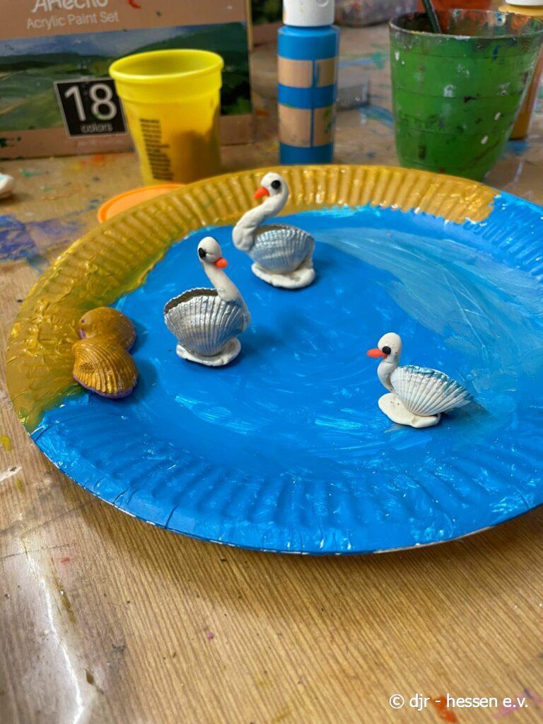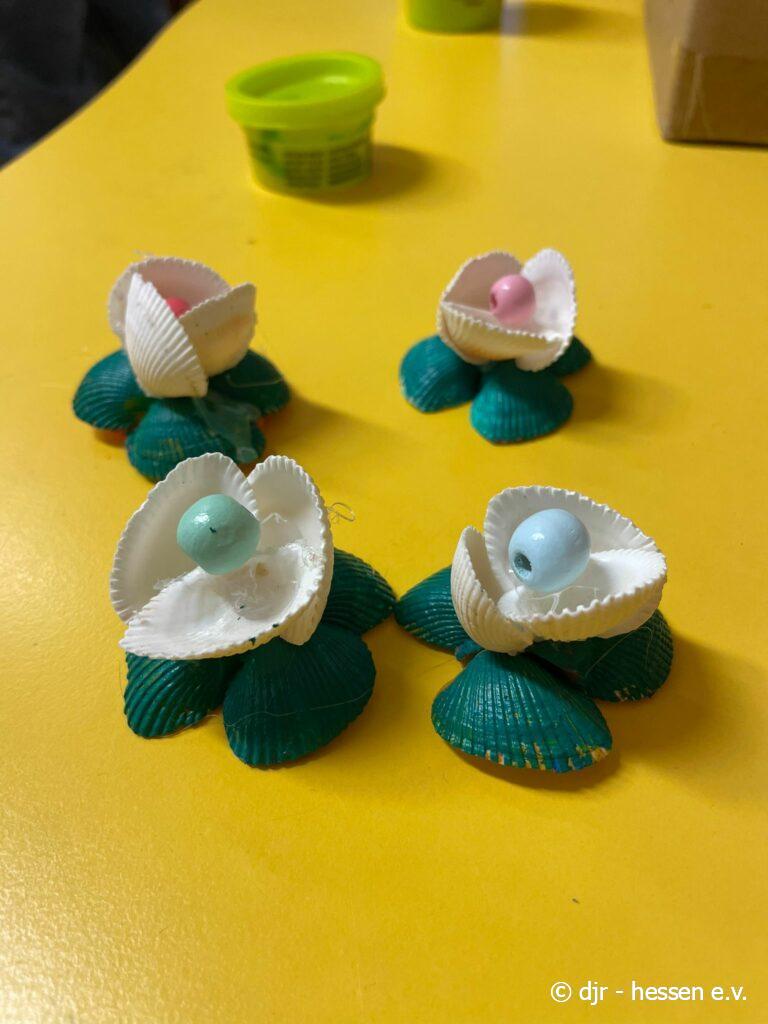 Die Kinder werden heute kreativ und basteln Figuren aus Muscheln.