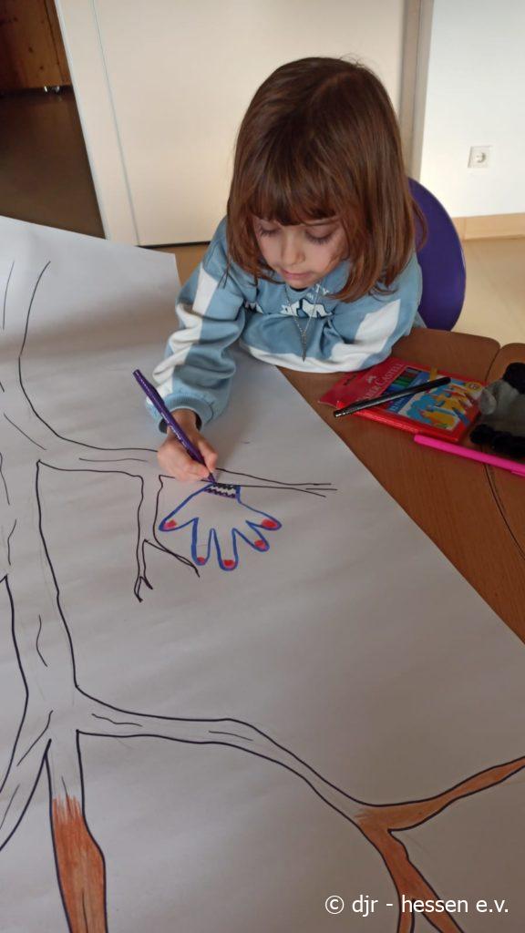 Für unseren Eingangsbereich haben die Kinder gemeinsam einen neuen Baum gestaltet, der die Besucher:innen willkommen heißen soll. Die winkenden Handabdrücke, gefüllt mit netten Worten, sorgen direkt für eine warme Atmosphäre, sodass man gar nicht mehr von hier weg möchte.