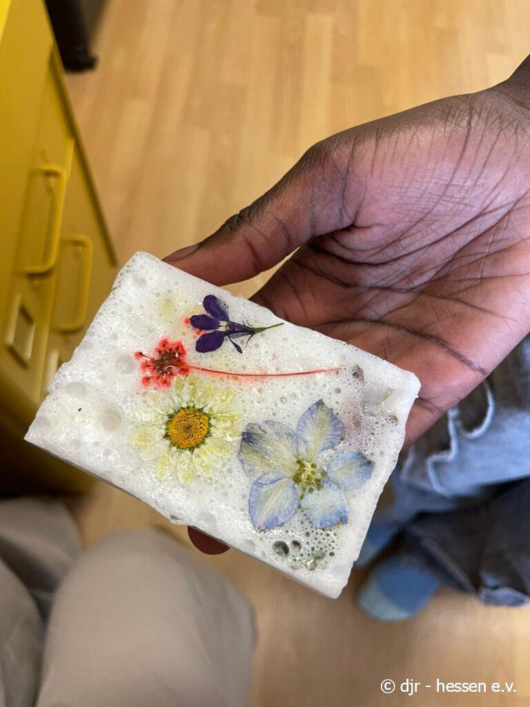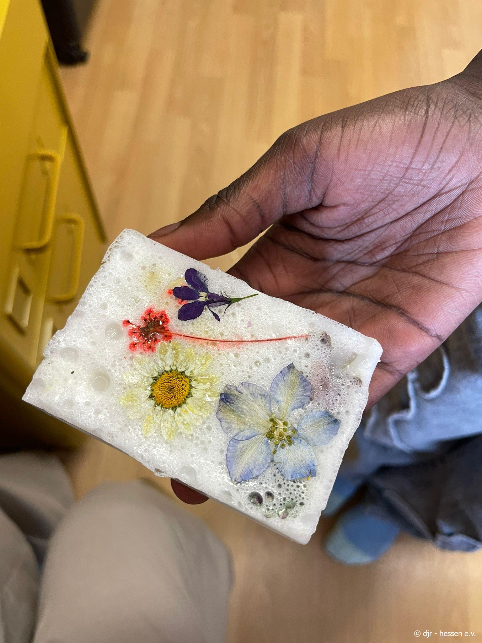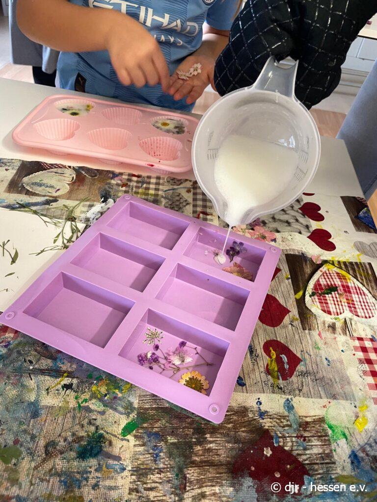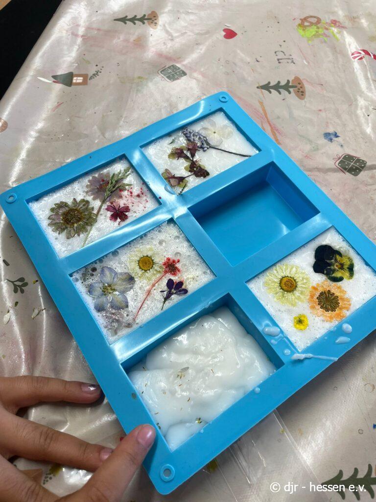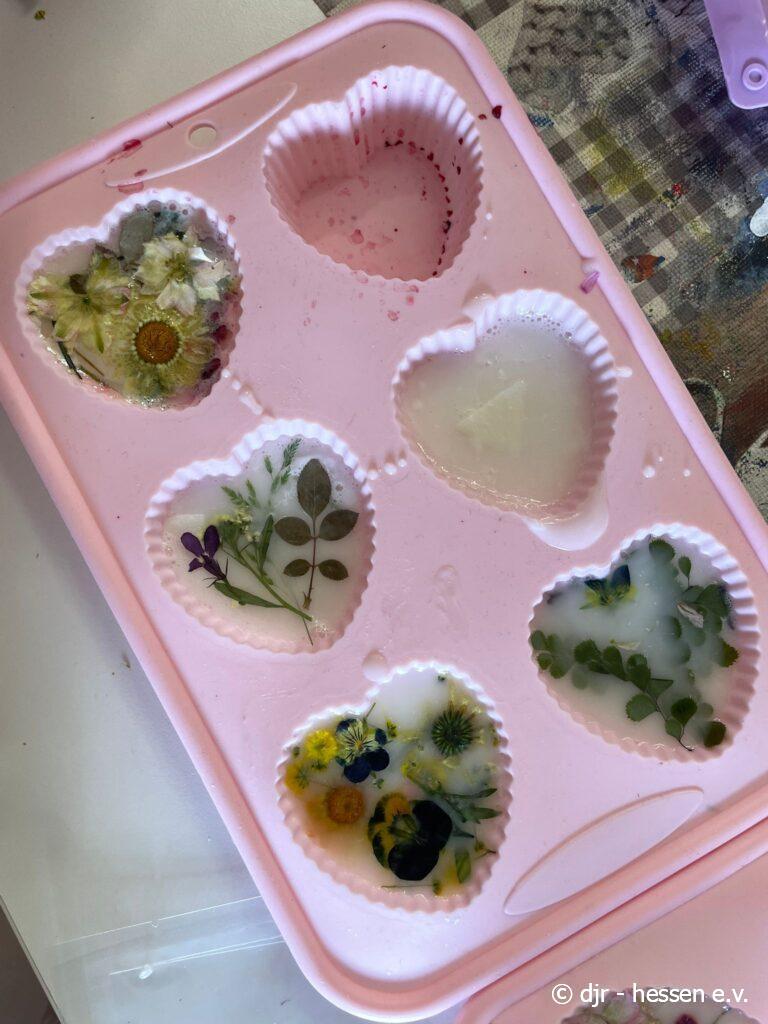 Ganz kunstvoll und besonders sieht die Seife aus, die die Kinder heute hergestellt haben! Die Seifenstücke eignen sich perfekt als Geschenk, aber auch für den eigenen Gebrauch.