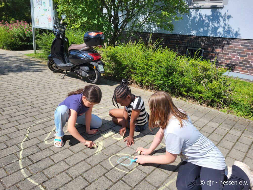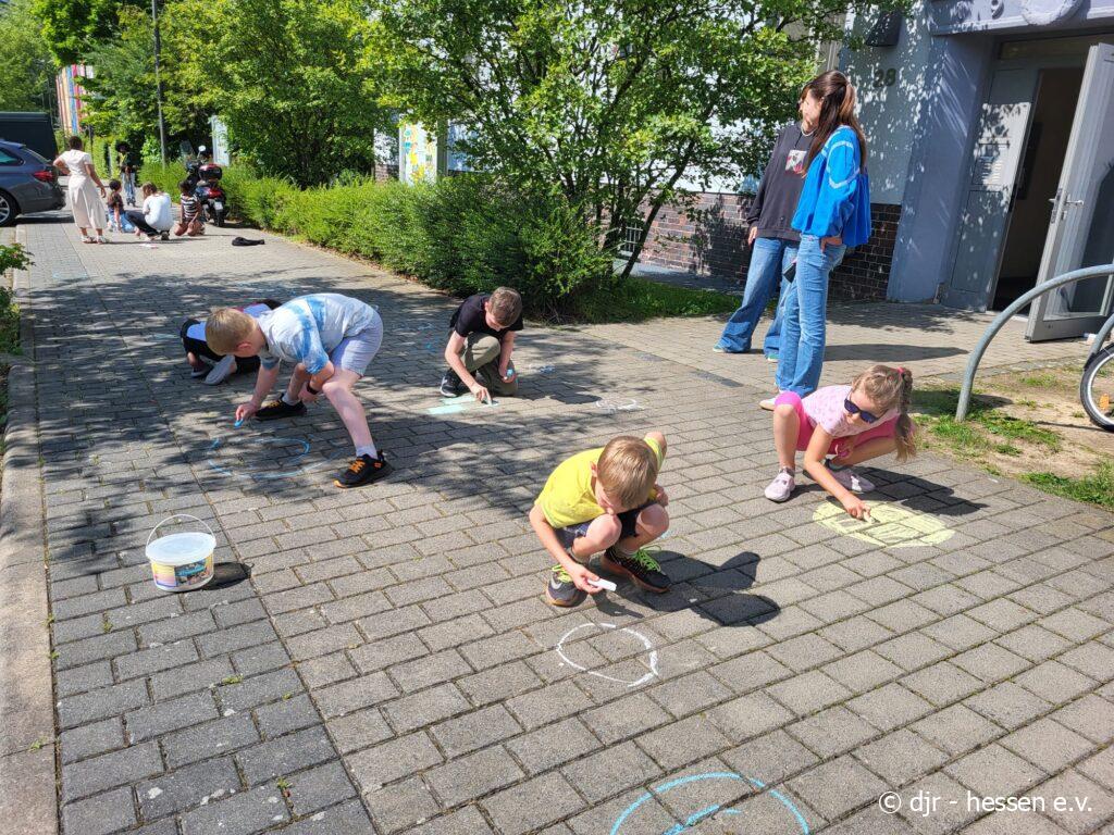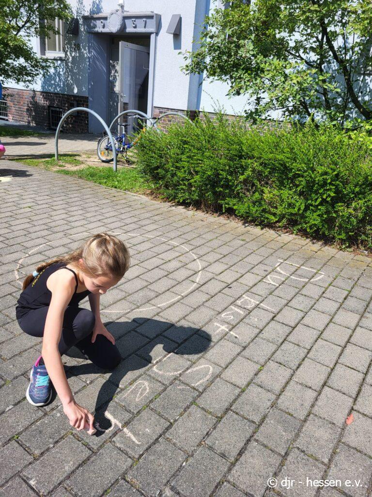 Die Kinder hinterlassen heute liebe Botschaften auf dem Asphalt. So können Nachbar:innen, Passant:innen im Vorbeigehen die lieben Nachrichten lesen und sich an ihnen erfreuen.