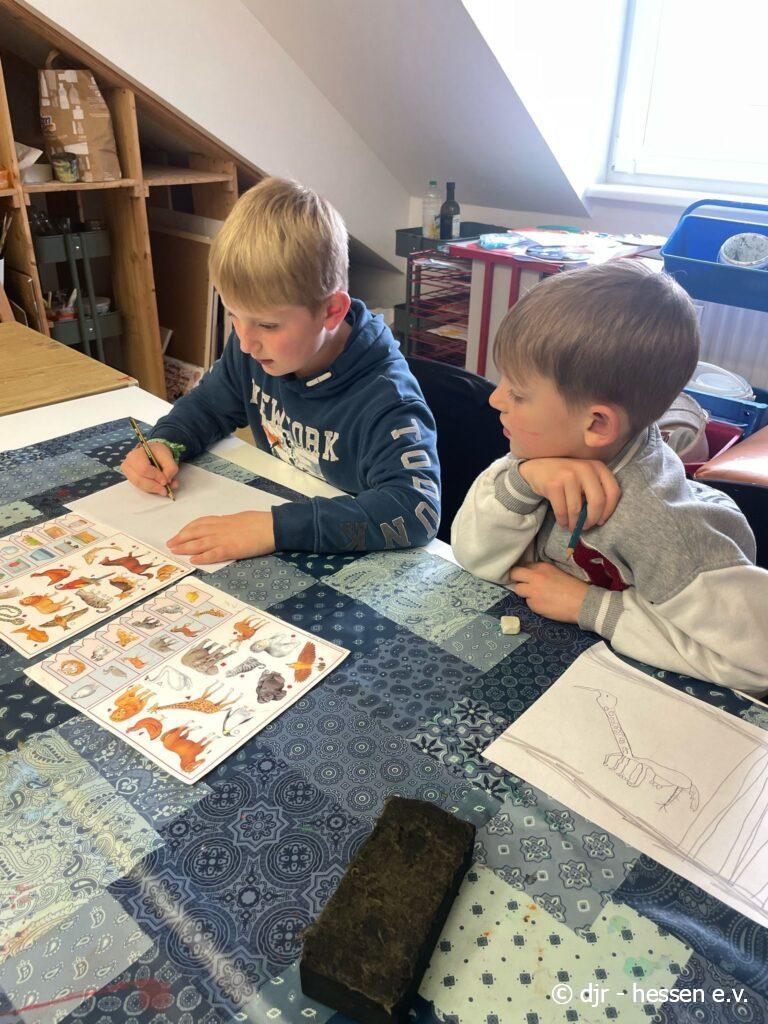 Die Kinder malen heute Tiere. Das Abmalen schult nicht nur ihr Gedächtnis, sondern macht auch Spaß. Hier findet jedes Kind sein Lieblingstier.