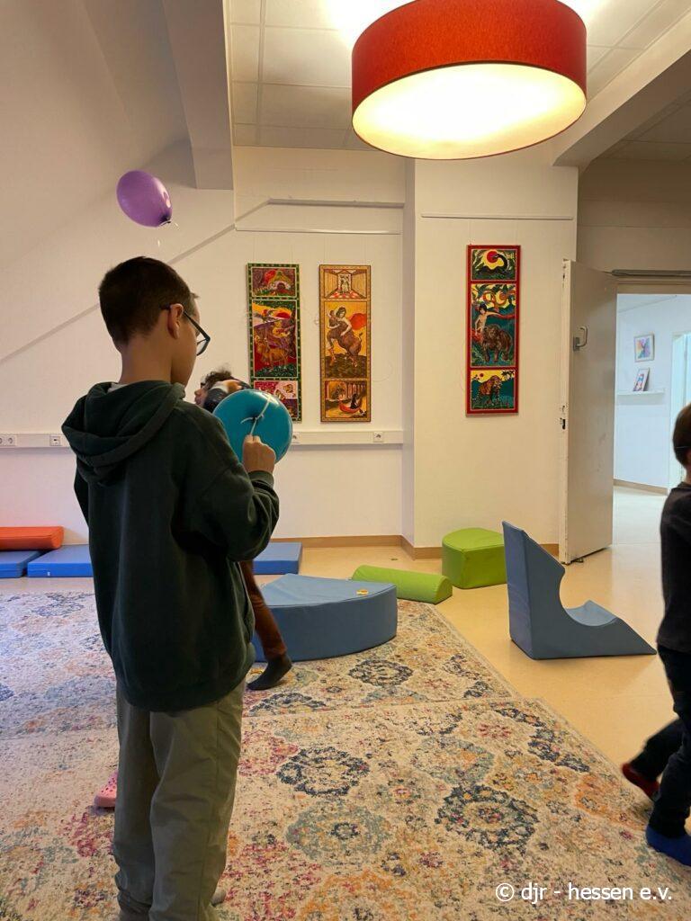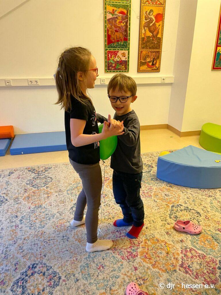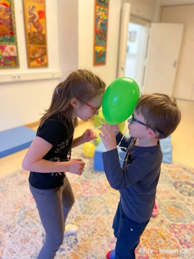 Die Kinder bewegen sich mit Luftballons zur Musik. Nicht nur ihre Balance wird gefördert, sondern auch die Zusammenarbeit im Team – berührt der Ballon den Boden, scheidet das Team aus.