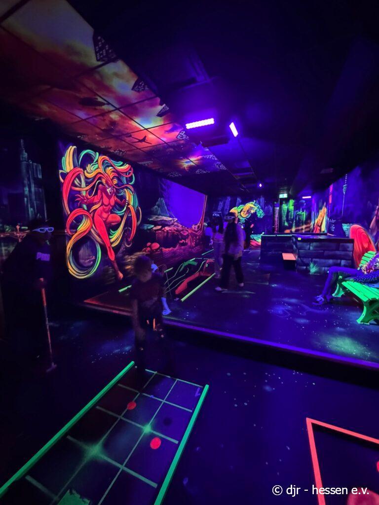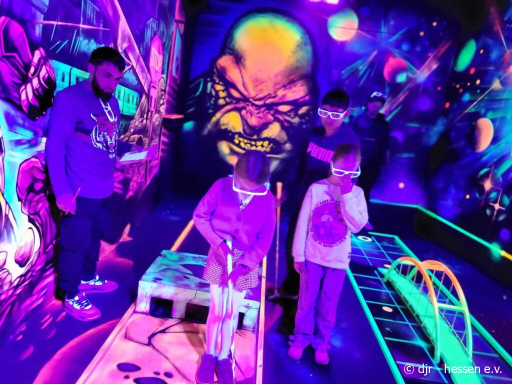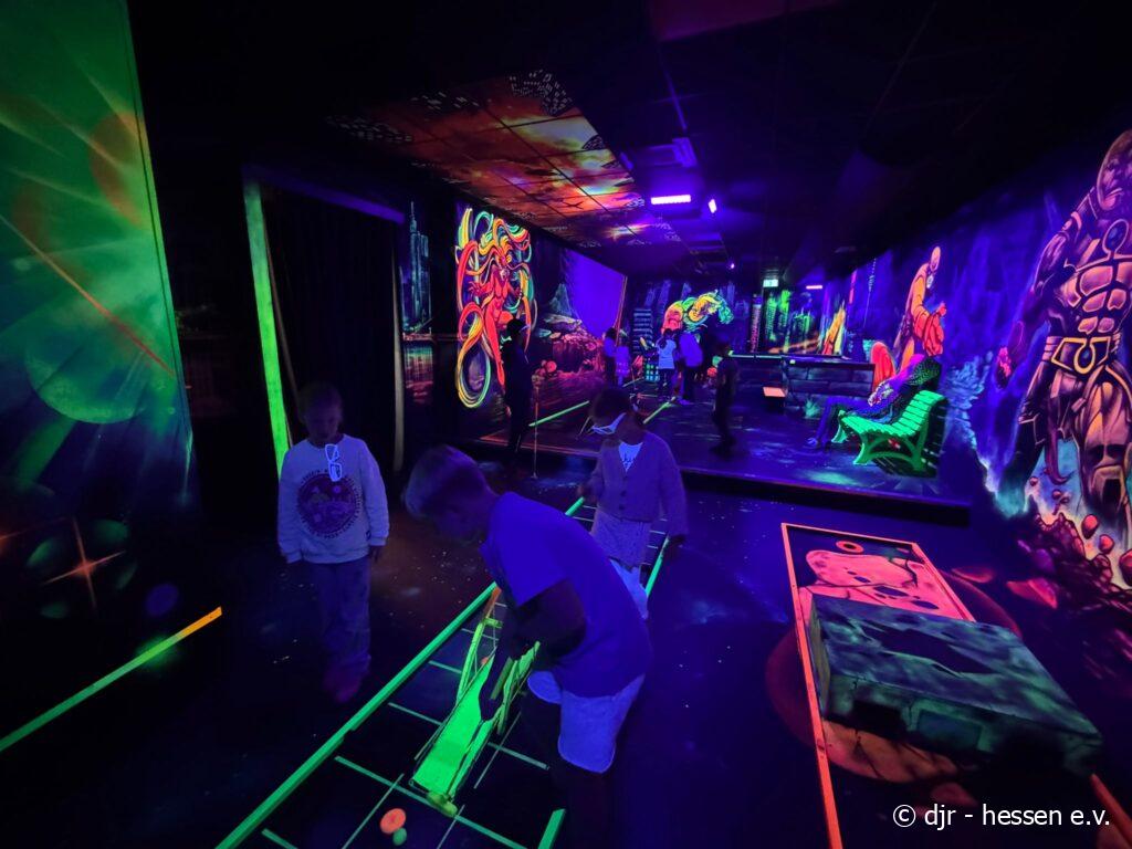 Heute spielen wir Minigolf! Im neonfarbenen Licht wirken die Parcours gleich viel aufregender und die Kinder haben hier umso mehr Spaß.