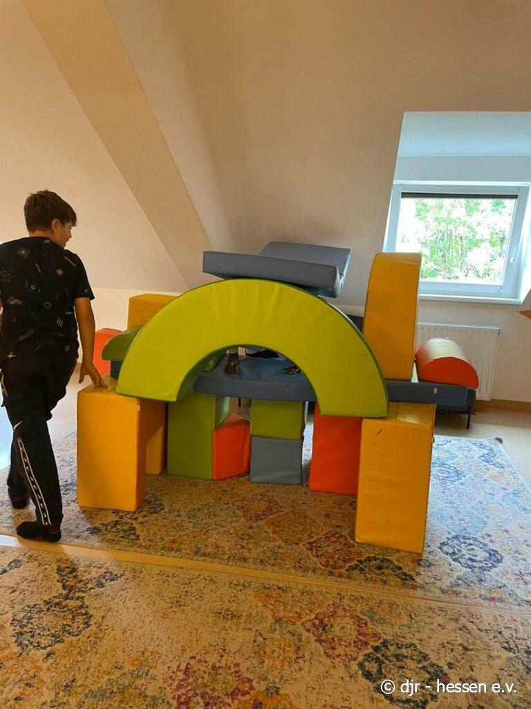Die Kinder nutzen verschiedene Materialien, um im Kinderclub zu bauen. Bausteine, Becher, Kugelbahn – alles ist mit dabei.