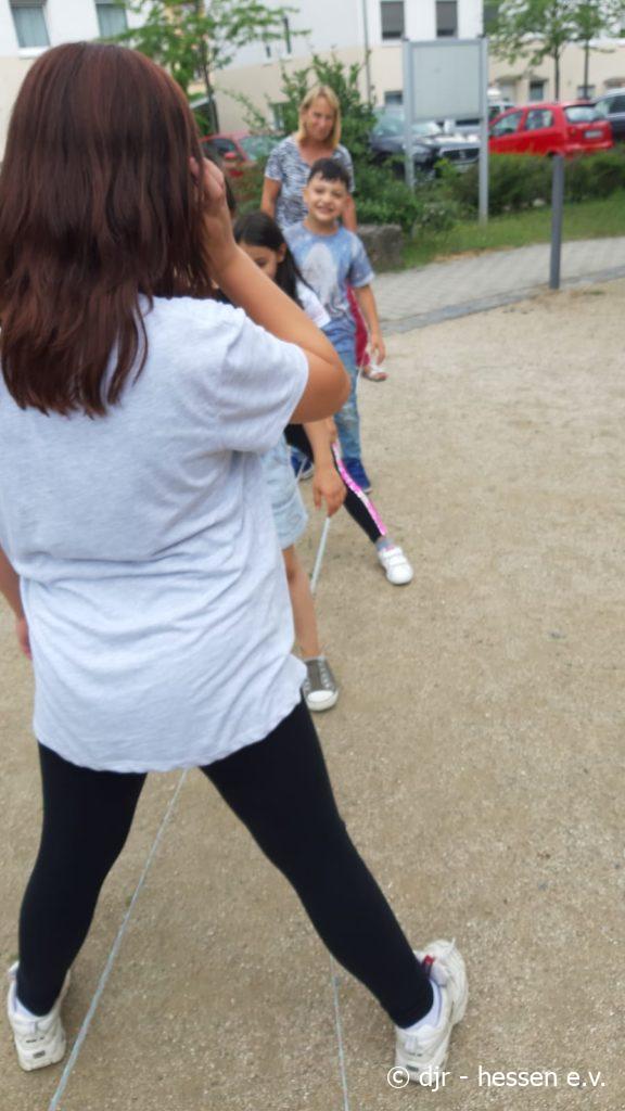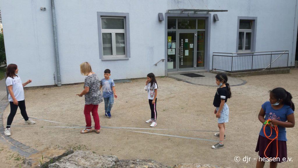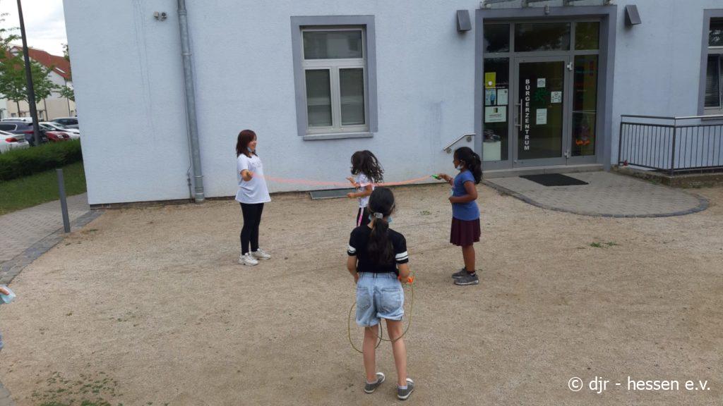 Heute haben wir uns draußen bewegt. Springseil, Gummiband, fangen… An der frischen Luft macht alles nochmal mehr Spaß.