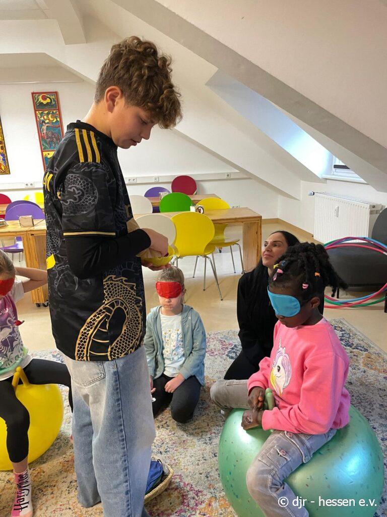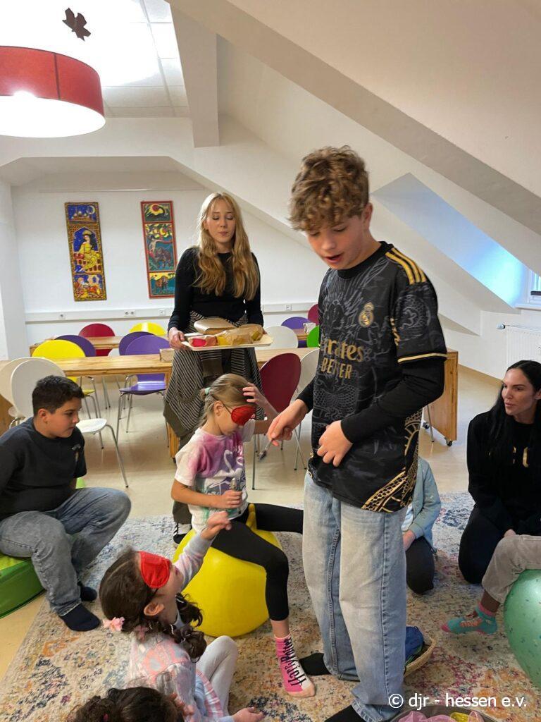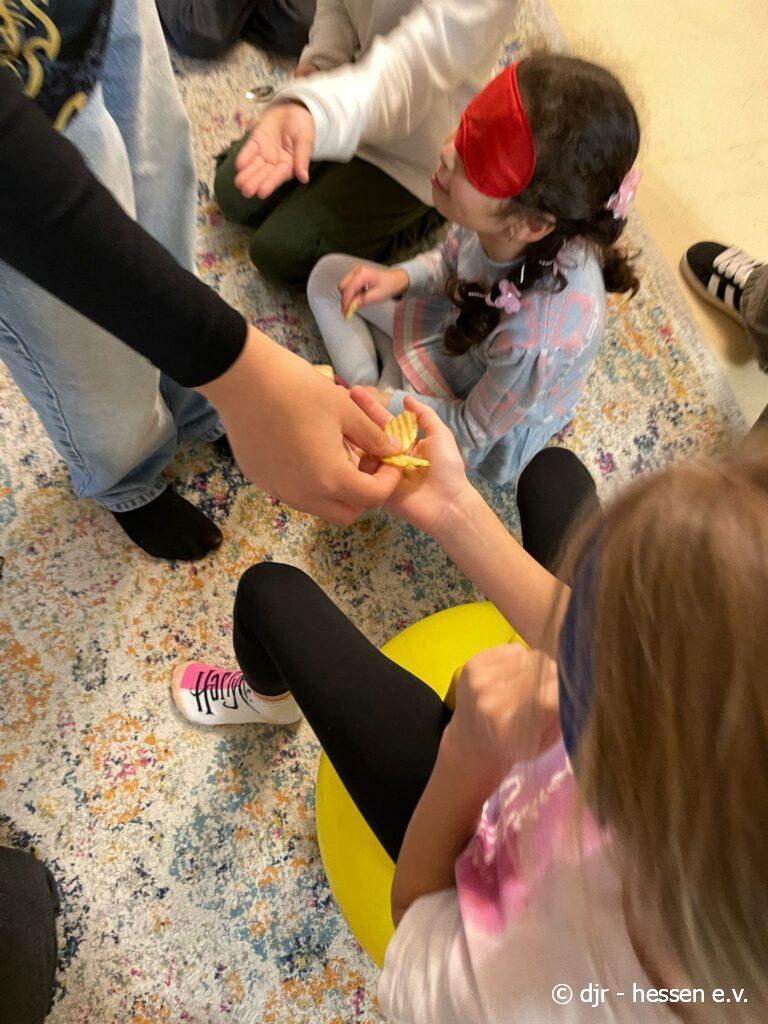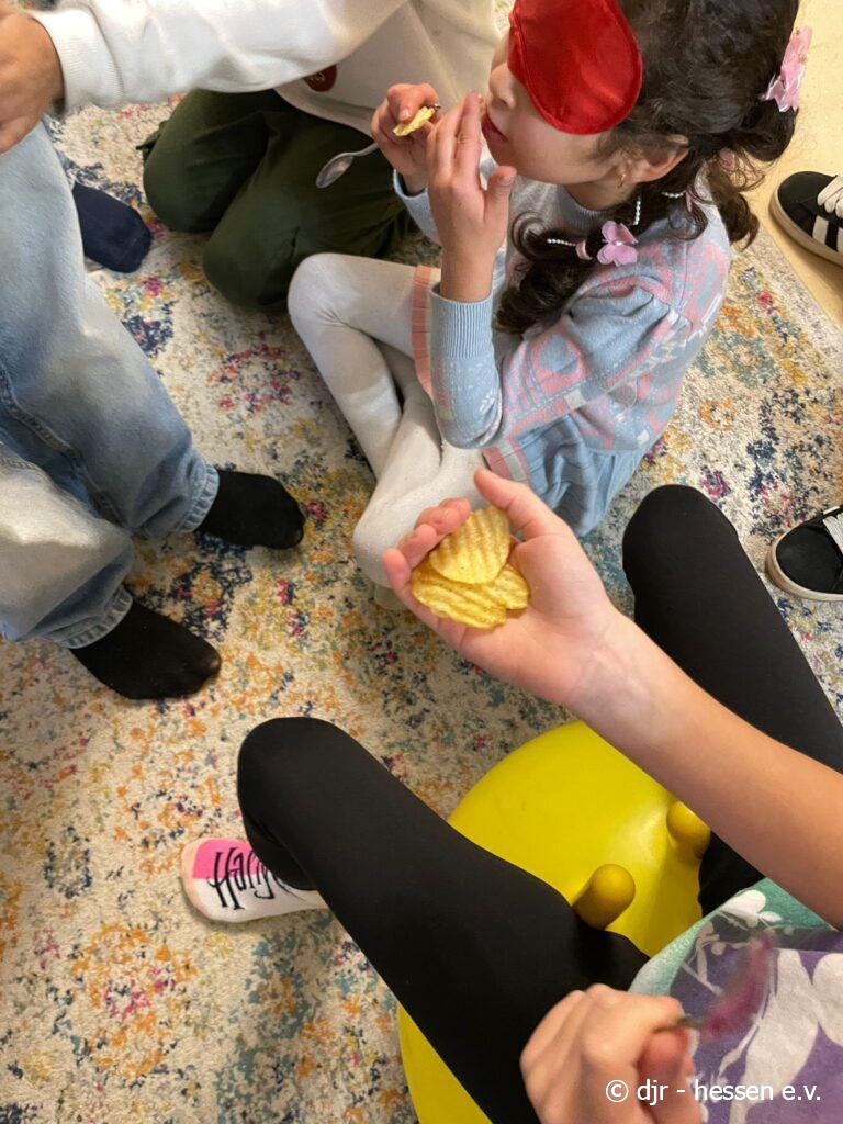 Die Kinder testen heute ihren Geschmackssinn: Mit geschlossenen Augen müssen sie erraten, welche Lebensmittel sie gerade im Mund haben. Gar nicht so einfach, wenn man sich die Lebensmittel nicht anschauen kann…