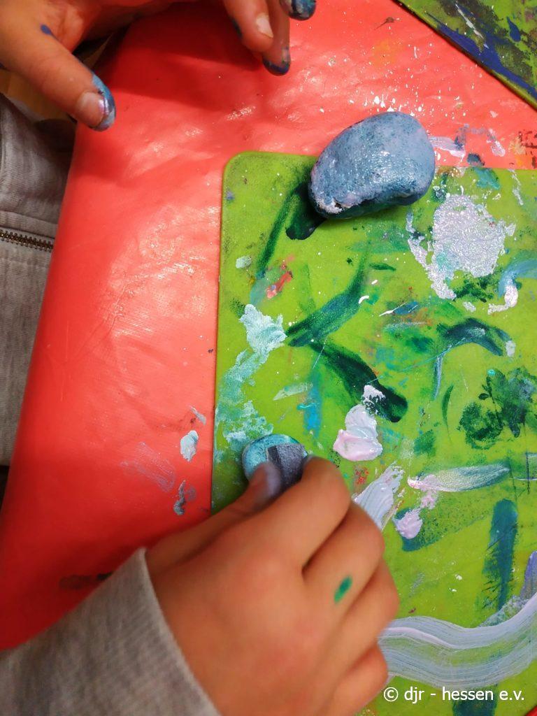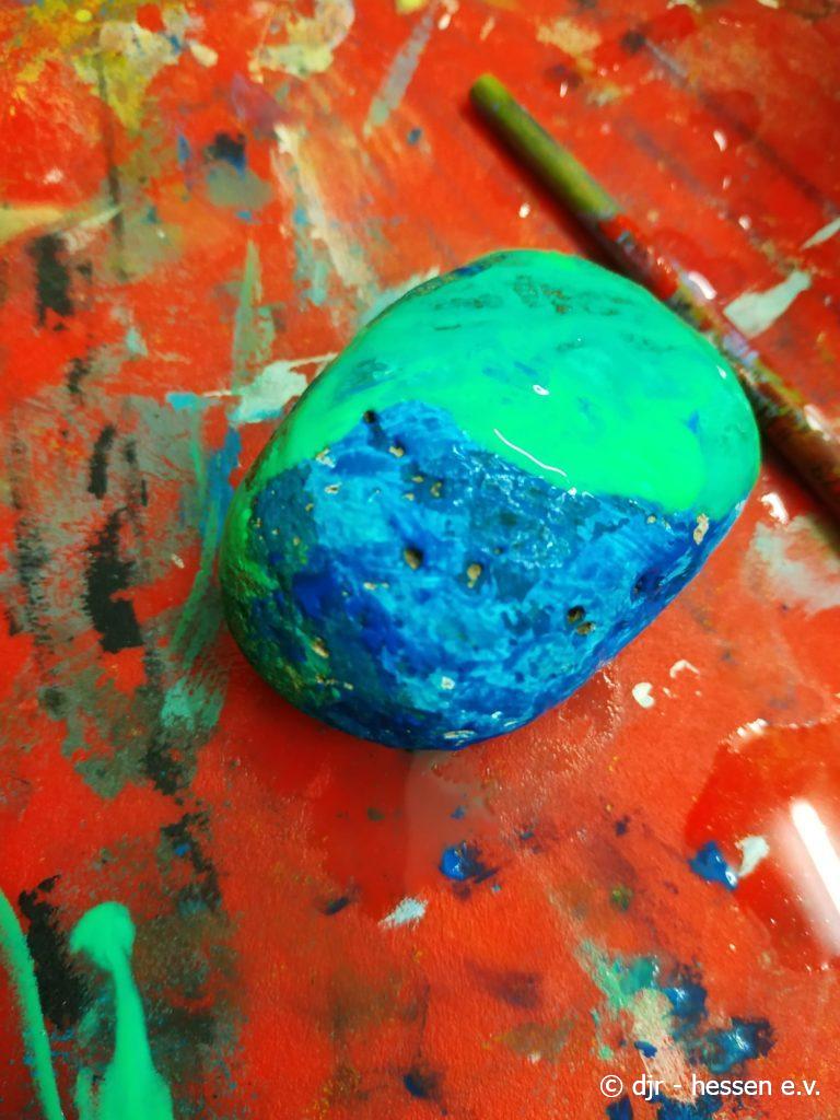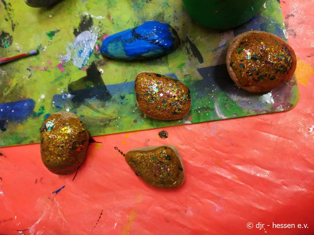 Mit Naturobjekten lässt sich viel Tolles gestalten: die Kinder heute haben die Idee gehabt, Steine schön mit Glitzerfarben zu bemalen. So ein Stein sieht nicht nur toll aus, er eignet sich auch gut als Geschenk.