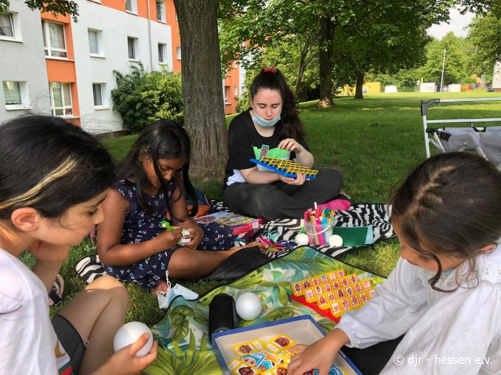 Wieso eigentlich alles im Kinderclub machen, wenn das Wetter es anderweitig anbietet? Mit diesem Gedanken im Kopf haben wir alle Spiele und Bastelsachen in den Wagen gepackt und haben es uns draußen auf der Wiese gemütlich gemacht. Bei schönem Wetter haben wir gemeinsam gespielt, gemalt und uns einfach entspannt.