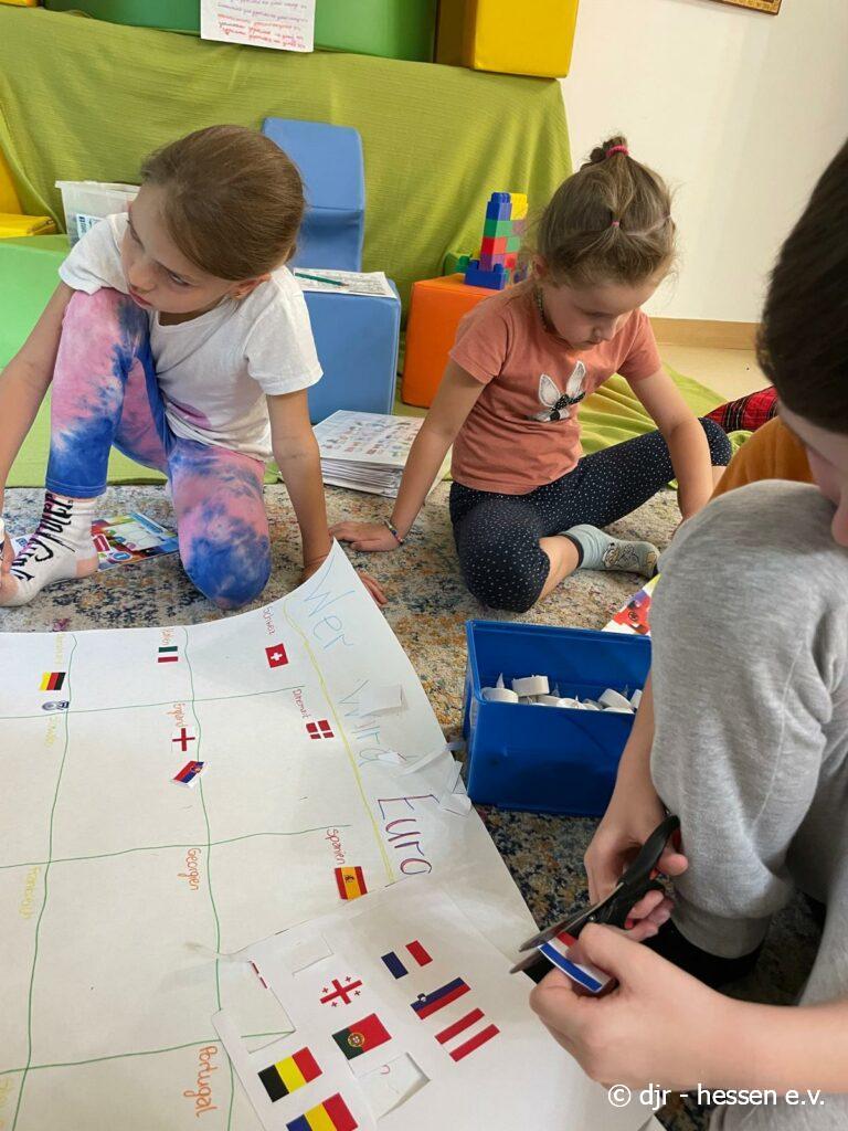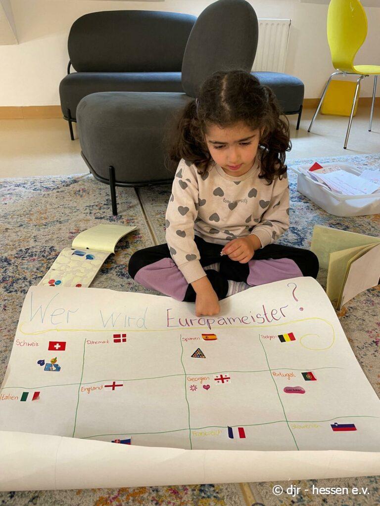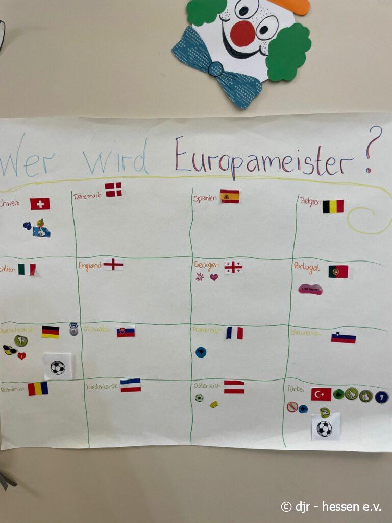 Auch ein gemeinsames Tippspiel darf nicht fehlen: Nachdem die Kinder die verschiedenen Flaggen dem passenden Land zuordnen und aufkleben können sie einen eigenen Sticker zu dem Land kleben, das die EM gewinnen wird. Mal schauen, wer am Ende richtig getippt hat…