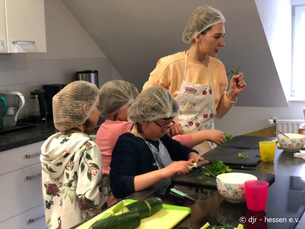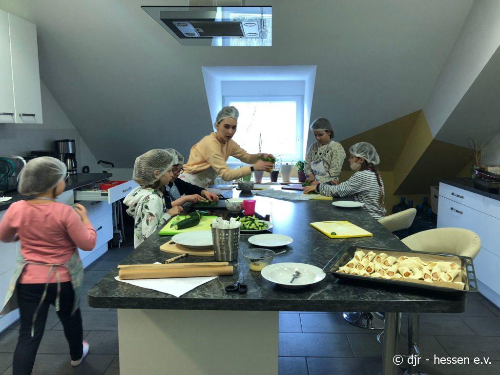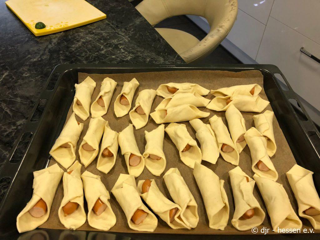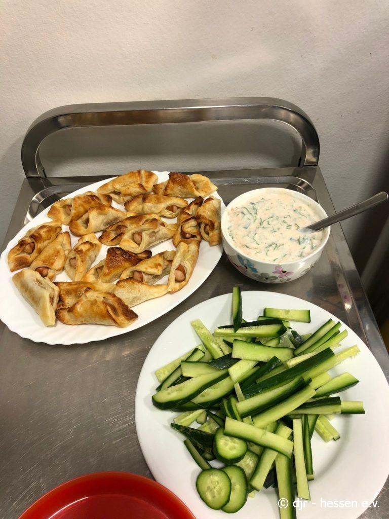 Die Kinder der Koch-AG haben heute Leckereien aus Blätterteig gebacken. Die bekannten Würstchen im Schlafrock (und die vegetarische Variante, Quark in Blätterteig), wurden begleitet von einem selbstgemachten Kräuterquark und Gemüse. Die Arbeit macht nicht nur Spaß, sondern schmeckt auch allen Teilnehmenden.