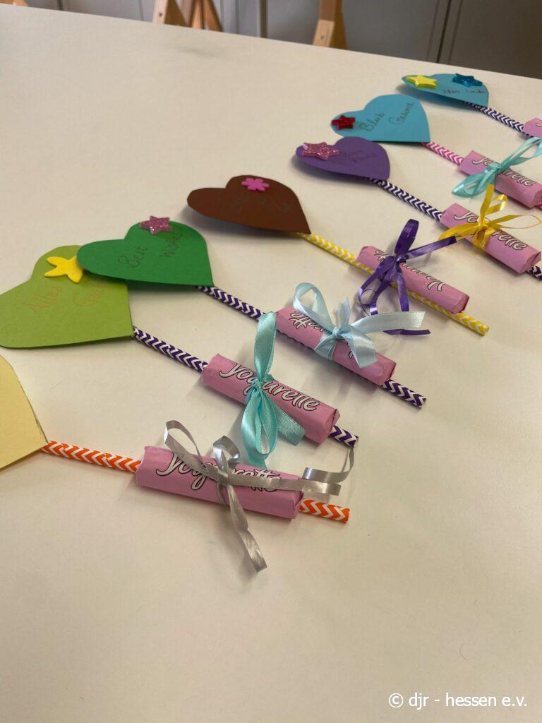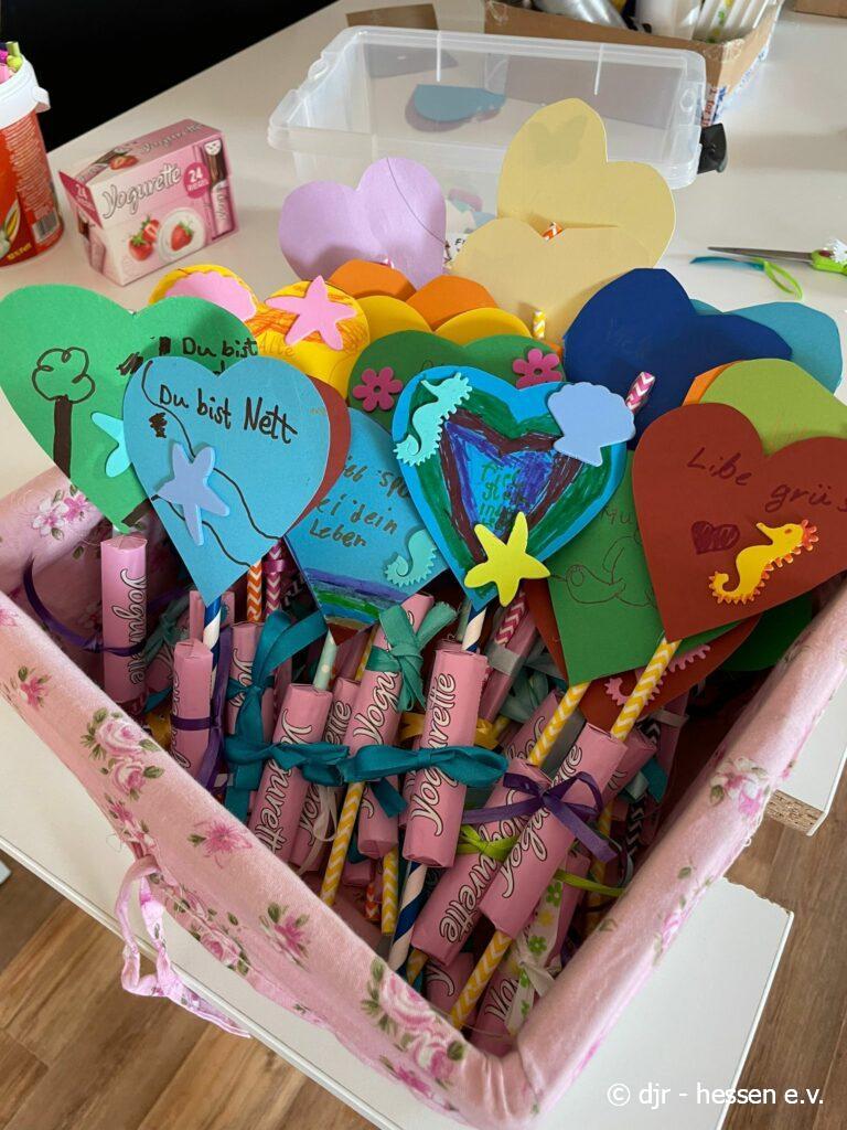 Die Kinder haben die Woche über Herzchen gebastelt, in die sie liebe Grüße reingeschrieben haben. Anschließend sind wir nach draußen gegangen, um diese lieben Worte an alle Menschen aus der Nachbarschaft zu verteilen.