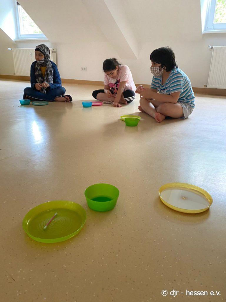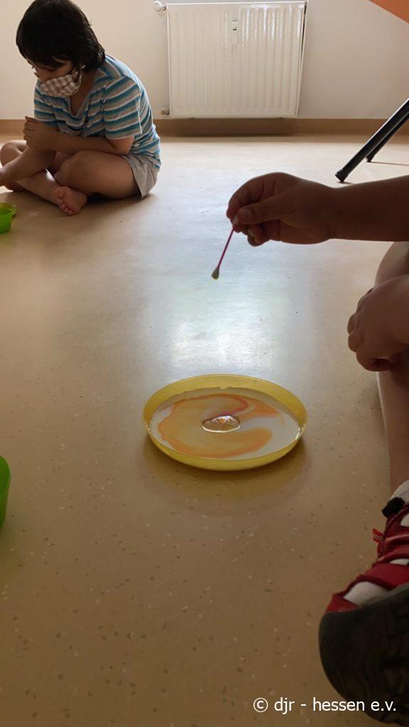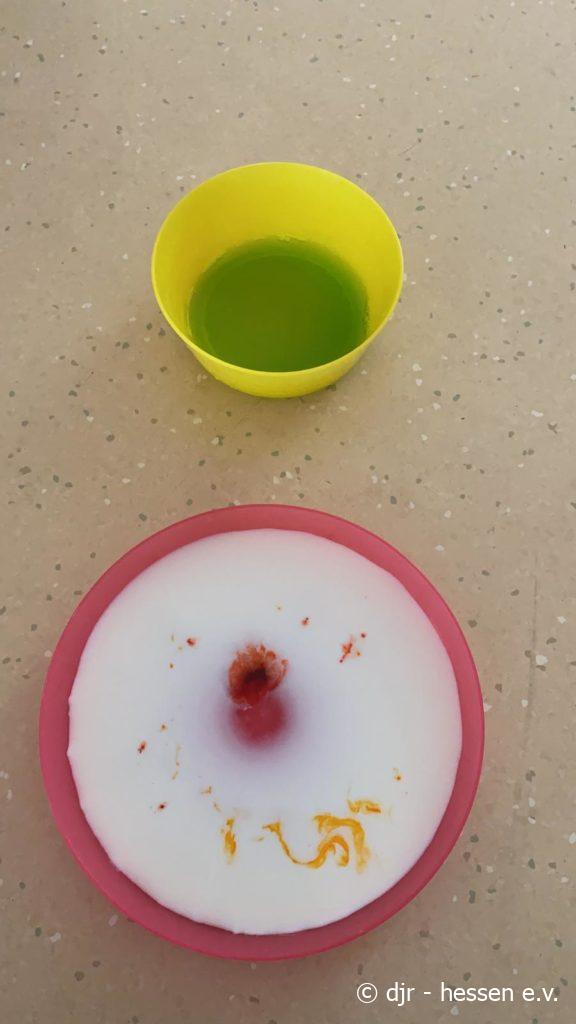Das hat garantiert noch keines der Kinder vorher gemacht- malen mit Milch. Ganz schön faszinierend, wie sich die Farbe in Kreisen auf der Milchoberfläche verbreitet… ein schöner Einstieg in einen lehrreichen und vielversprechenden Tag.