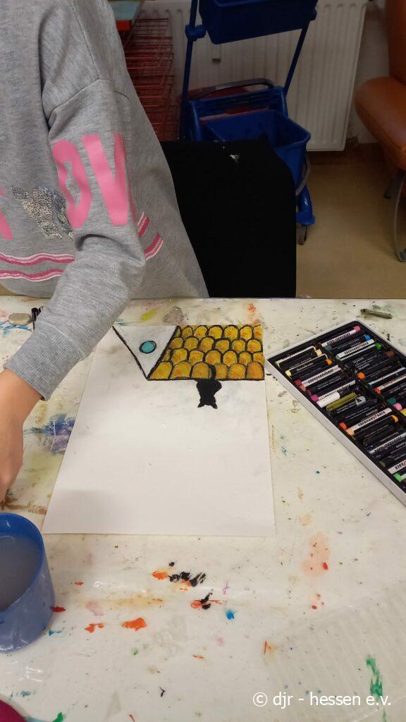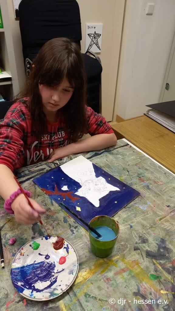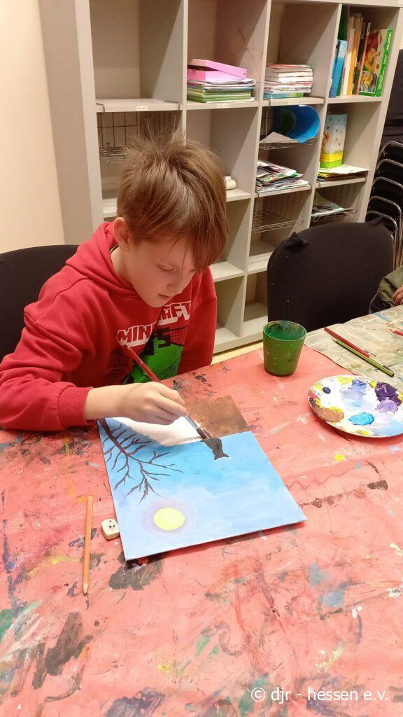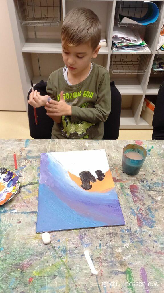 Die Kinder erschaffen heute Kunstwerke auf Leinwänden, die nun den Eingangsbereich des Kinderclubs schmücken.