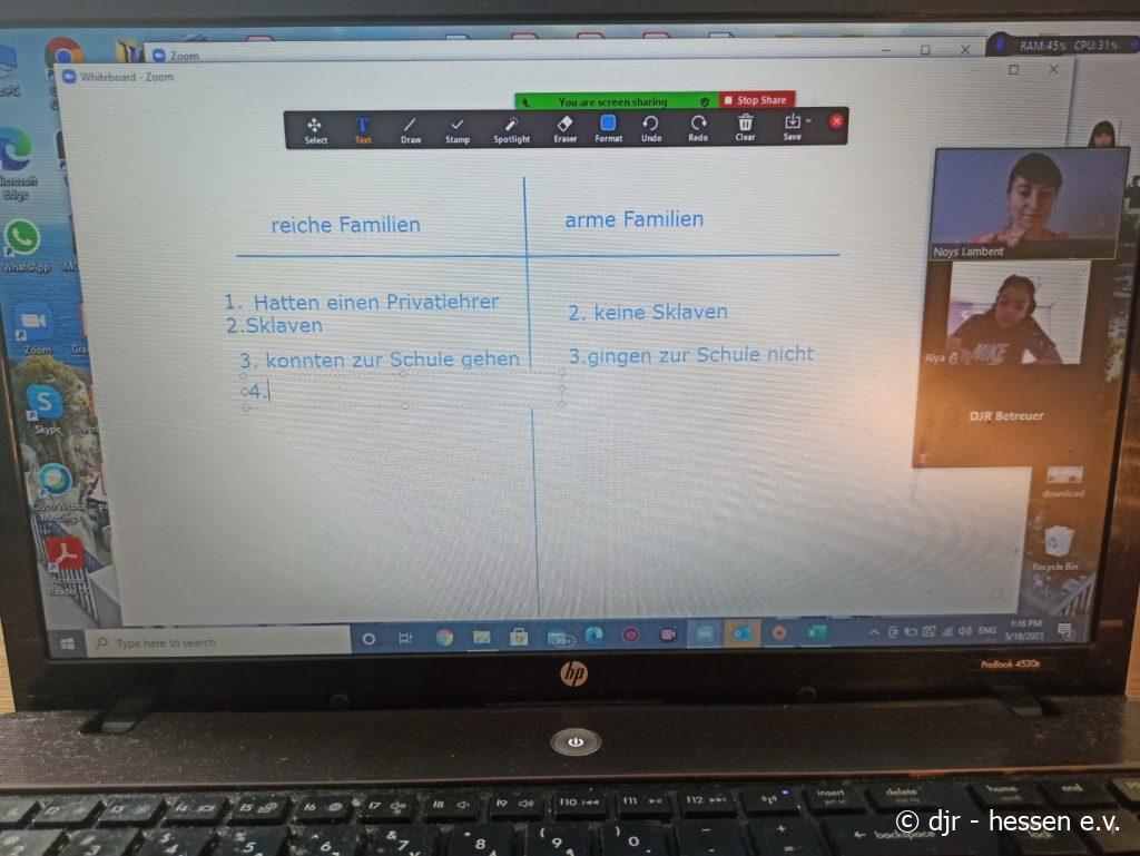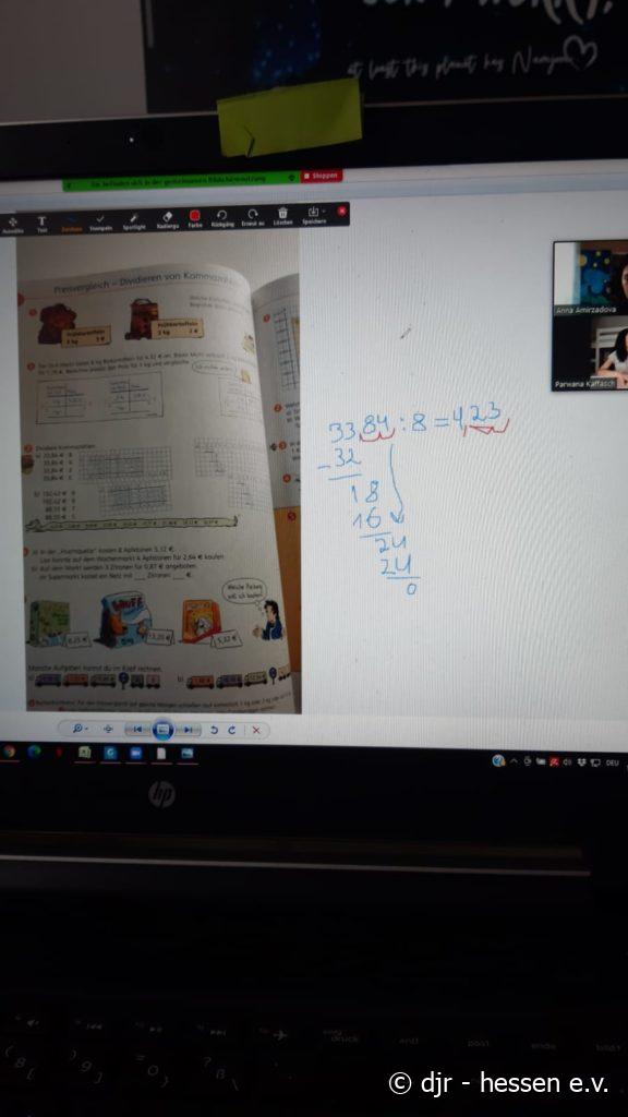 Momentan geben wir deshalb 20 Kindern über Zoom Hausaufgabenhilfe. Die Hilfe wird gebraucht, da die Kinder zum großen Teil immer noch von zu Hause aus lernen. Gemeinsam erarbeiten wir uns alle Fragen und Unklarheiten, sodass die Kinder ihre Hausaufgaben gut erledigen und verstehen.