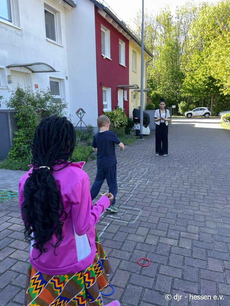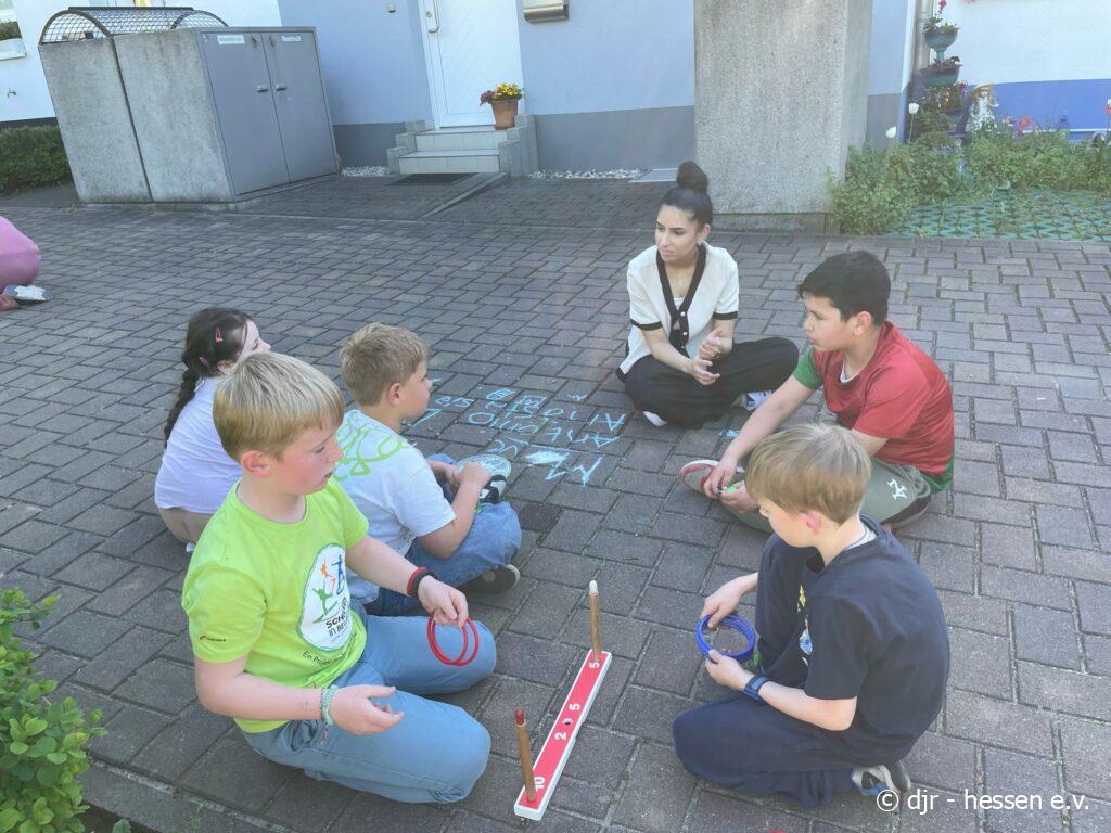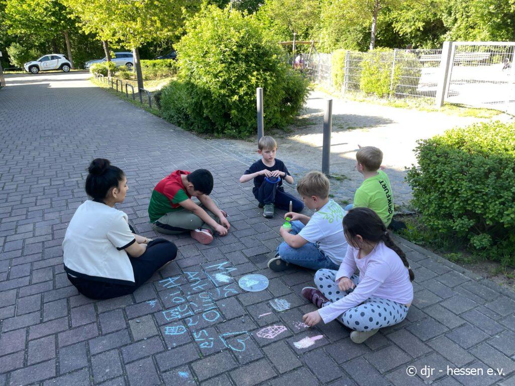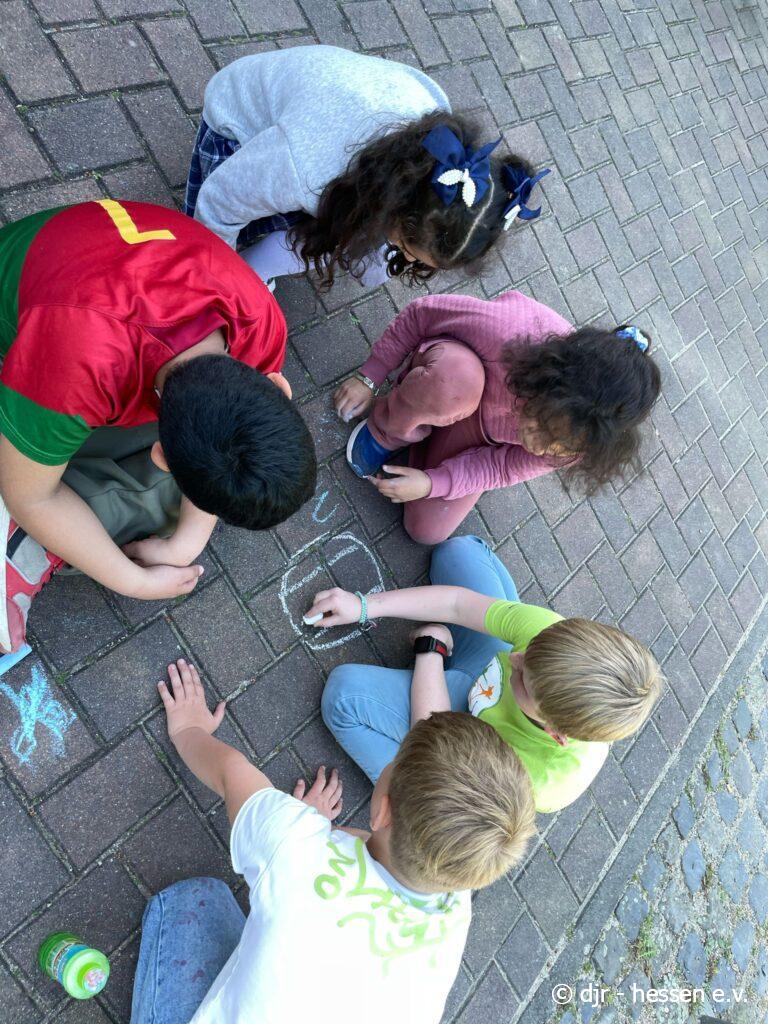 Die Sonne scheint, die Temperaturen werden wärmer: Die Kinder genießen das Wetter an der frischen Luft, zwischen Spielplatz und Kreide, Bewegung und Entspannung.