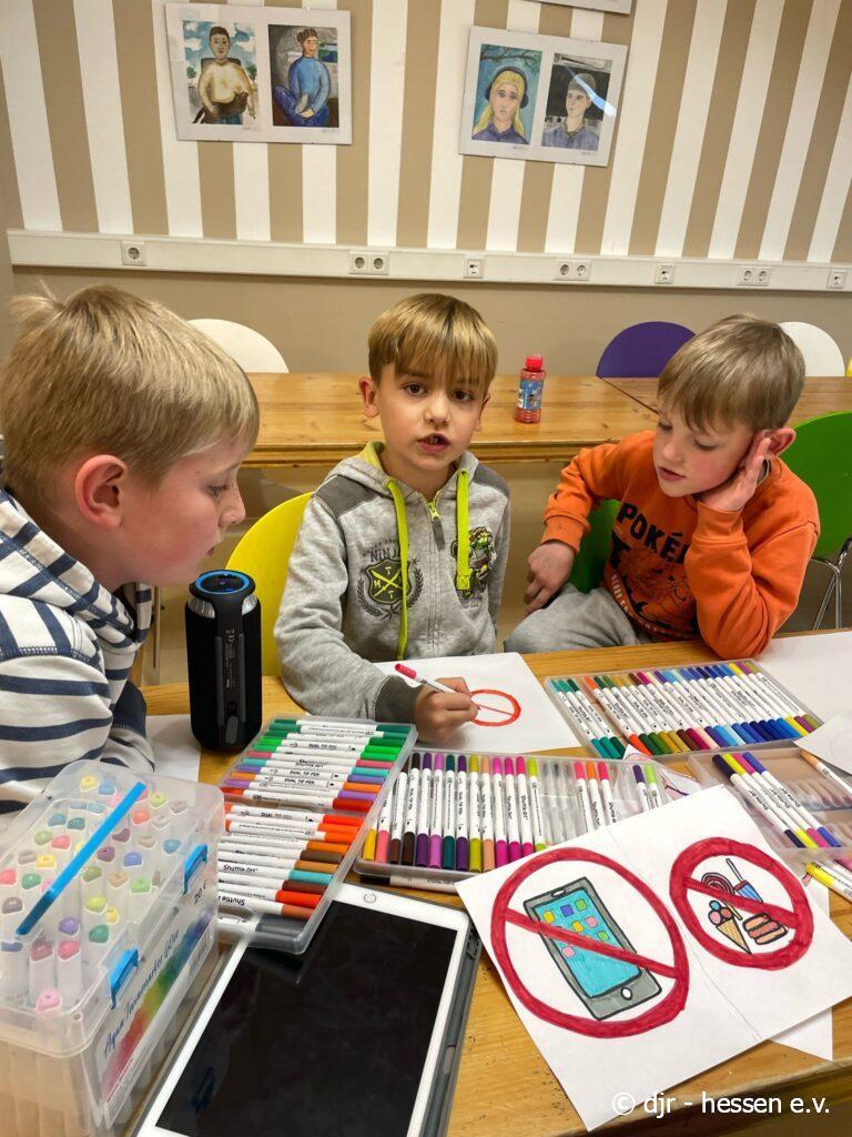 Die Kinder basteln neue Aushänge für den Kinderclub. Damit ein friedliches Zusammenleben gelingt, überlegen sich die Kinder gemeinsam Regeln, an die sich alle halten sollen. Als Erinnerung daran verewigen sie diese in Aushängen.