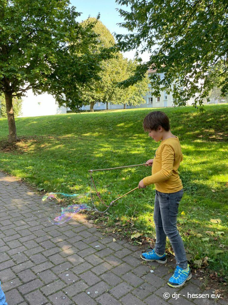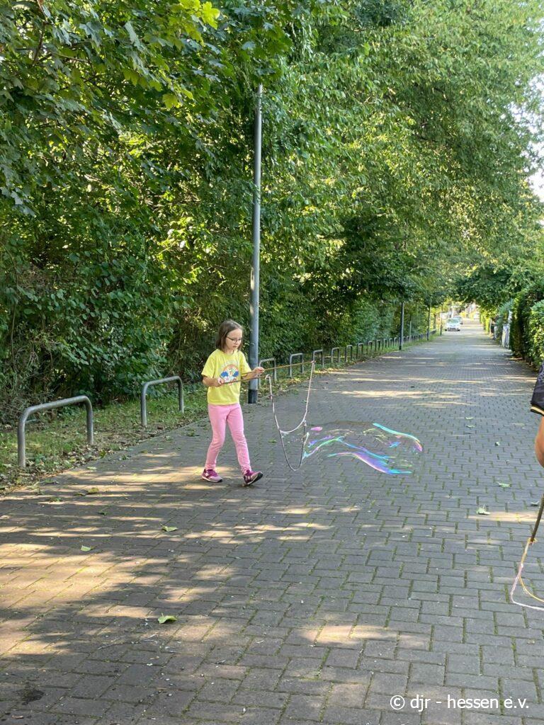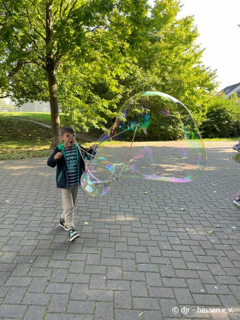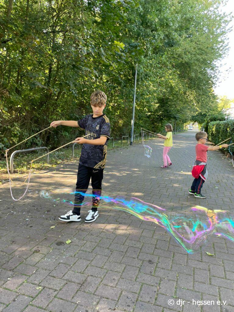 Am Weltkindertag lassen wir uns eine besondere Aktion einfallen: Gemeinsam mit den Kindern stellen wir Riesenseifenblasen her! Eine Kunst, die erstmal geübt werden muss. Sobald die Kinder den Dreh raushaben, stellen sie die unterschiedlichsten und größten Seifenblasen her.