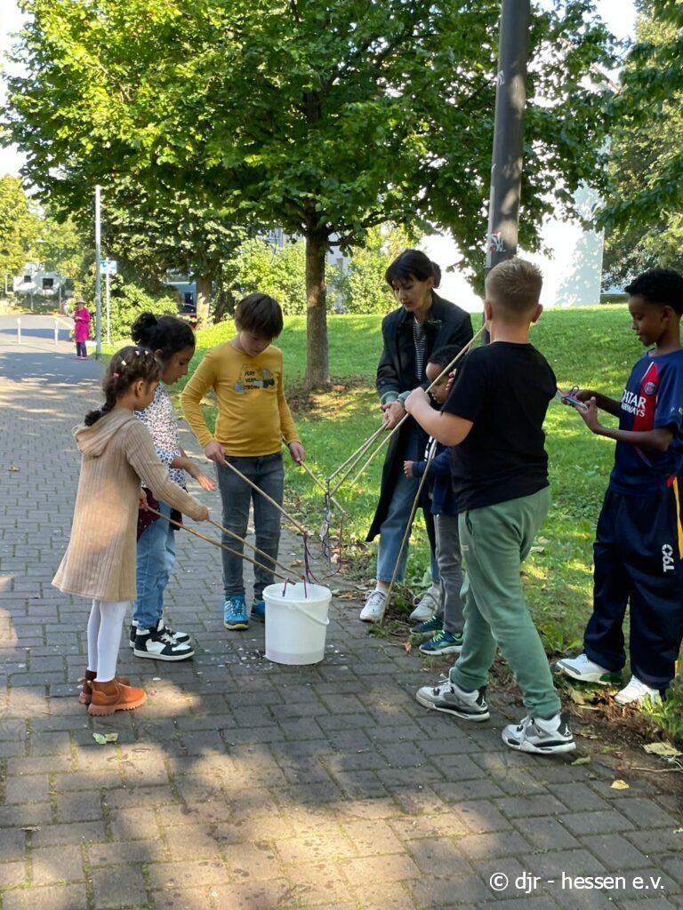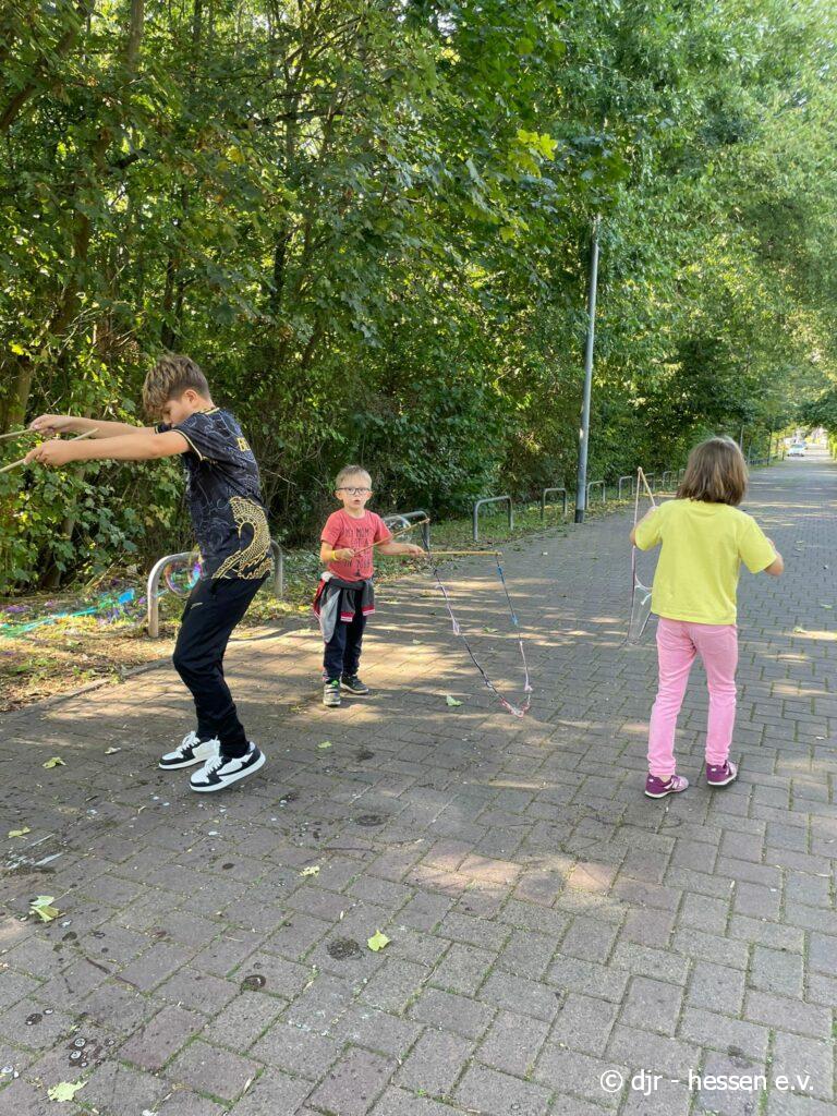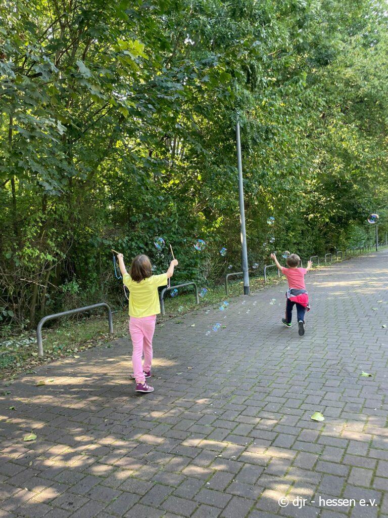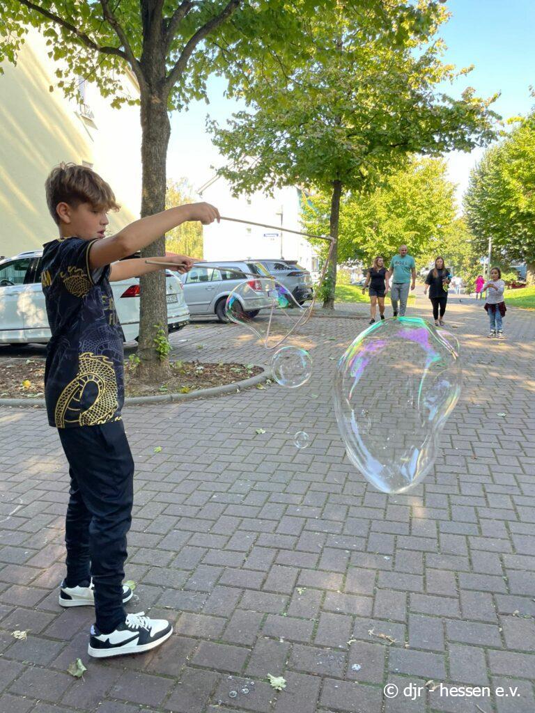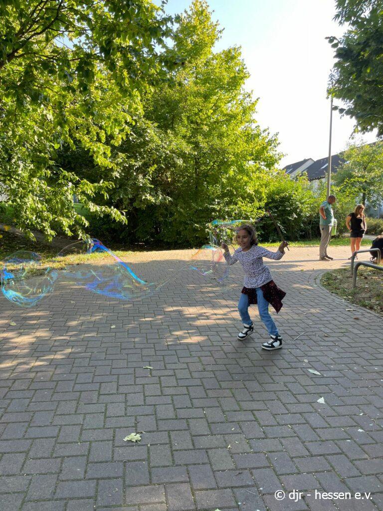 Am Weltkindertag lassen wir uns eine besondere Aktion einfallen: Gemeinsam mit den Kindern stellen wir Riesenseifenblasen her! Eine Kunst, die erstmal geübt werden muss. Sobald die Kinder den Dreh raushaben, stellen sie die unterschiedlichsten und größten Seifenblasen her.