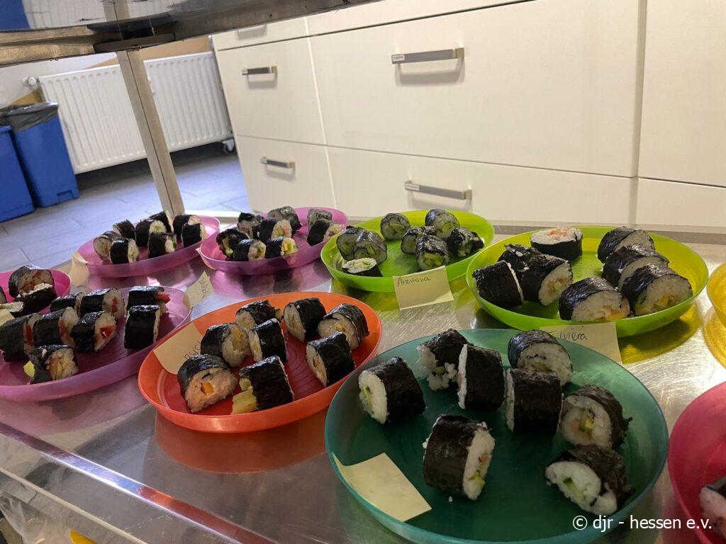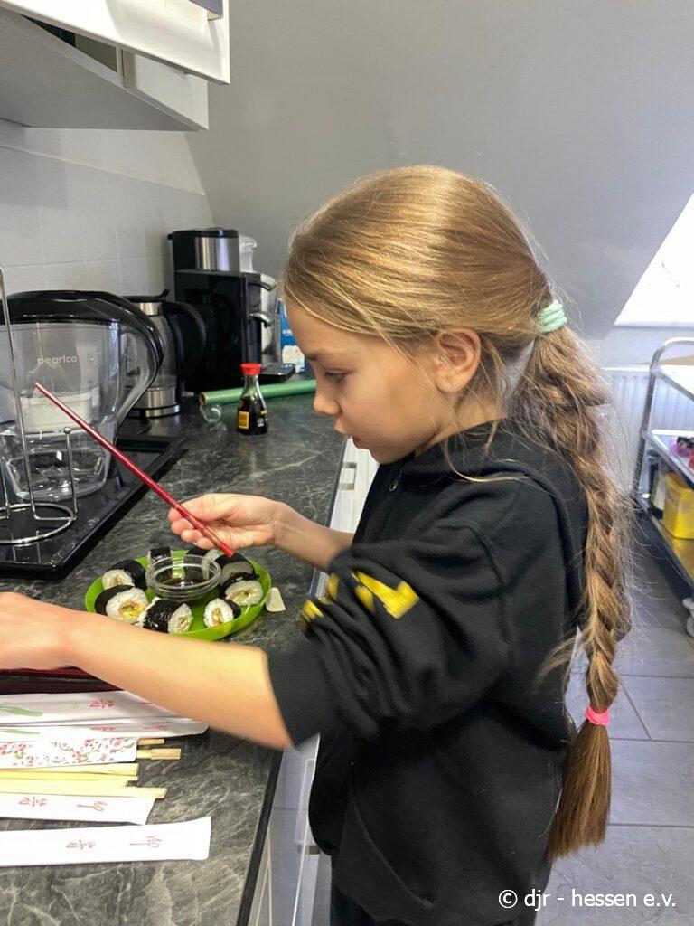Die Kinder sind heute besonders fleißig und stellen ihr eigenes Sushi her. Einige von ihnen probieren dieses Gericht heute zum ersten Mal, das Herstellen davon ist aber für alle von ihnen ein Erlebnis.