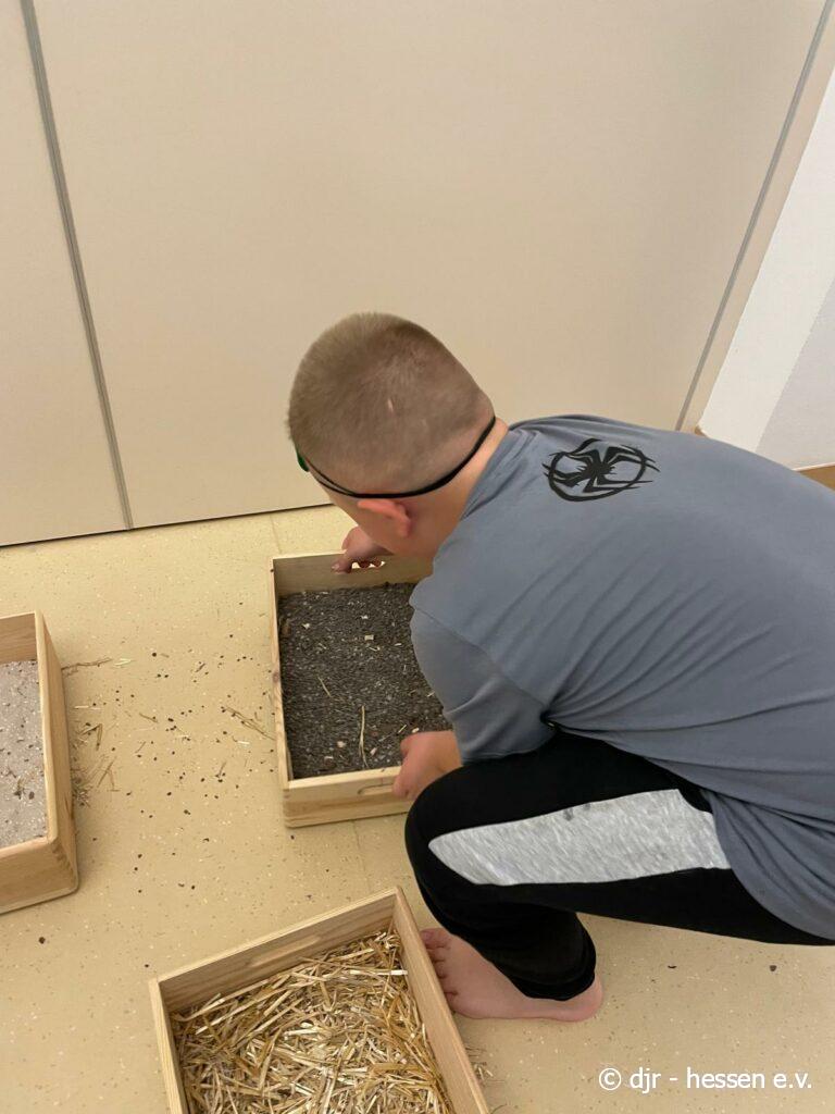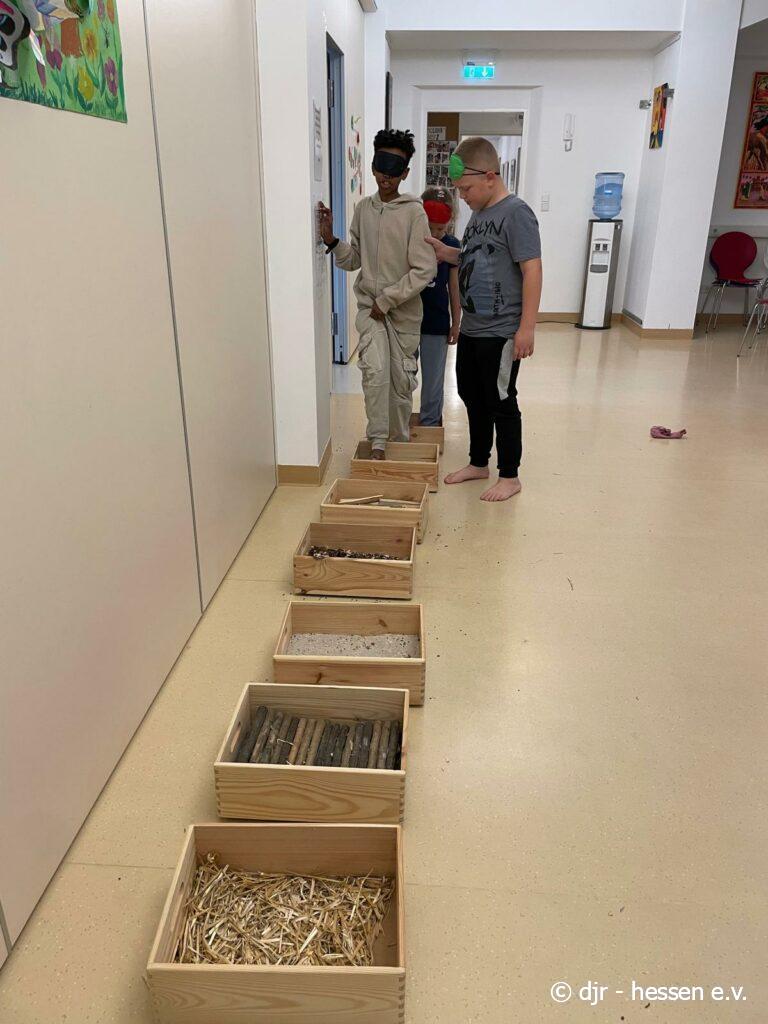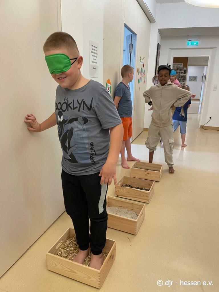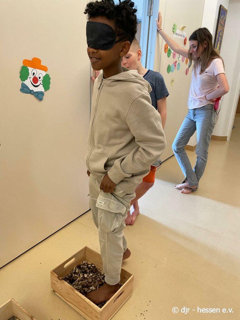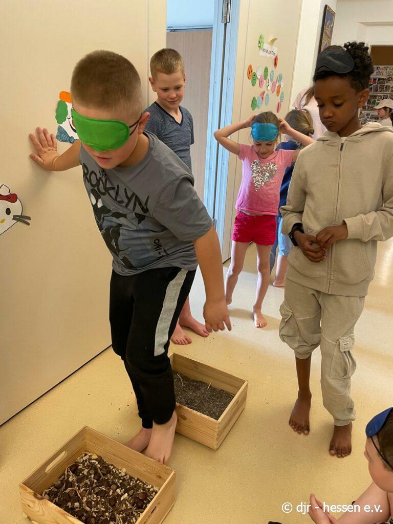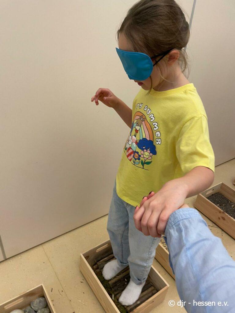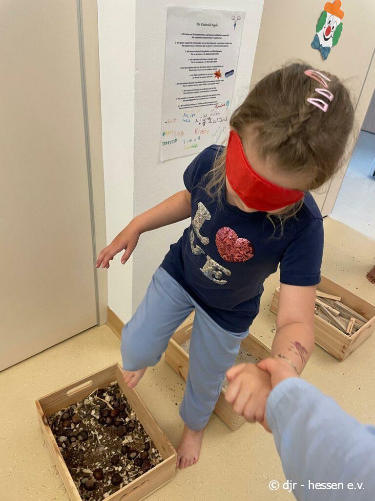 Heute geht es wieder darum, den Fühlsinn der Kinder zu testen. Mit verbundenen Augen begeben sie sich auf den Barfußpfad und fühlen die verschiedenen Naturmaterialien. Wer kann erfühlen, um was es sich dabei handelt?