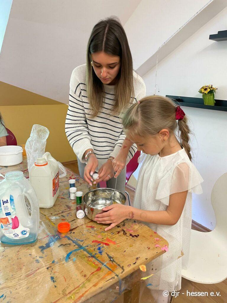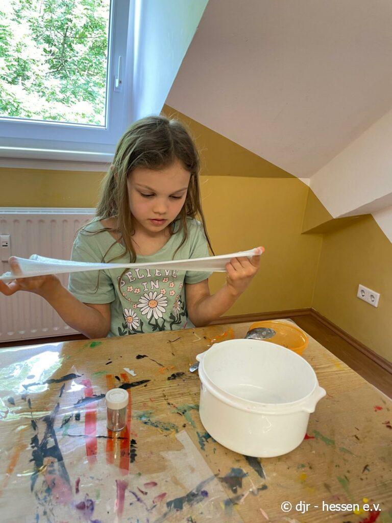 Die Kinder stellen heute ihren eigenen Slime her. Das Kneten des Slimes fördert die Feinmotorik der Kinder und in der Herstellung können sie ihrer Kreativität freien Lauf lassen.