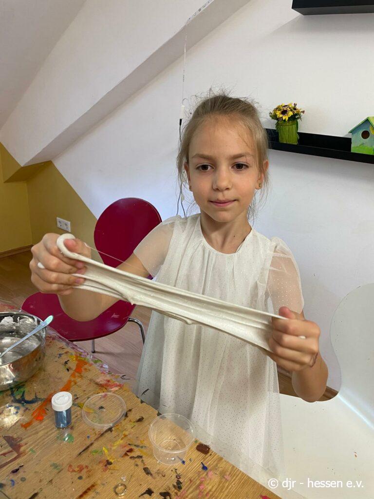 Die Kinder machen immer mit großer Freude Slime. Wie in einem Labor sieht es bei uns aus, wenn sie am arbeiten sind.
