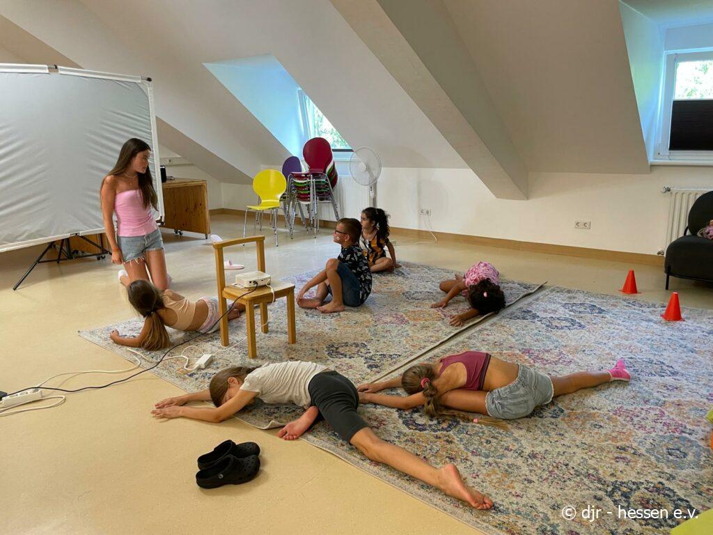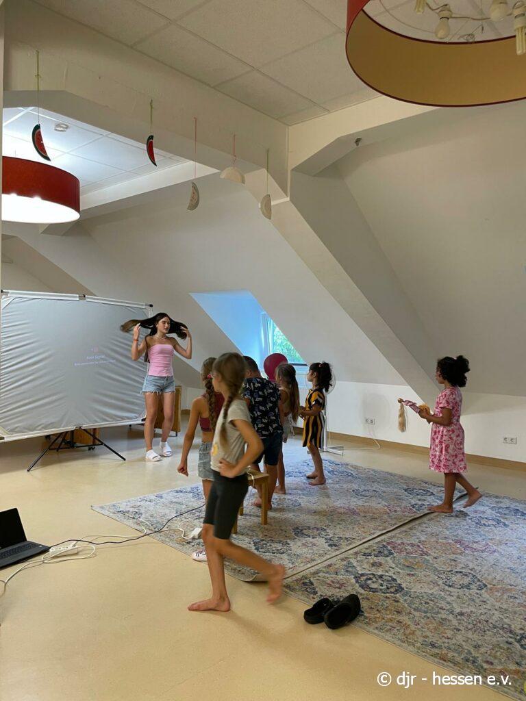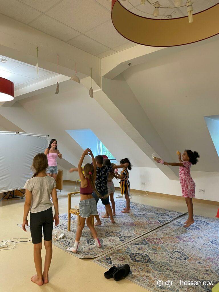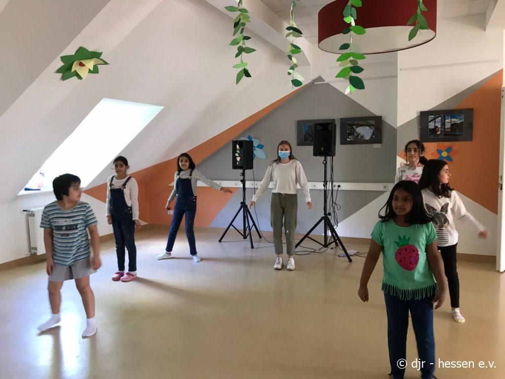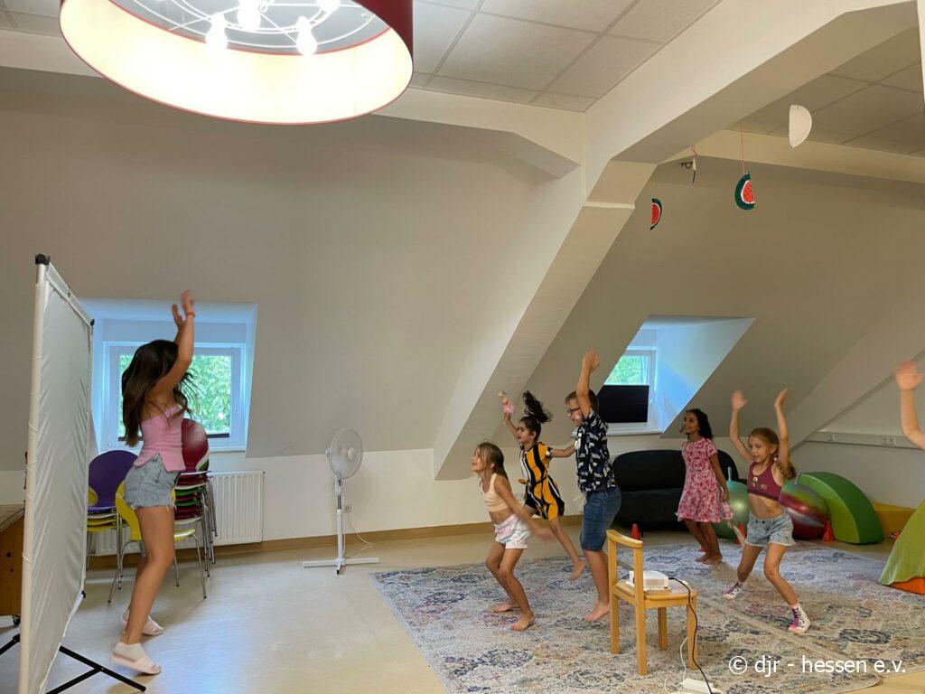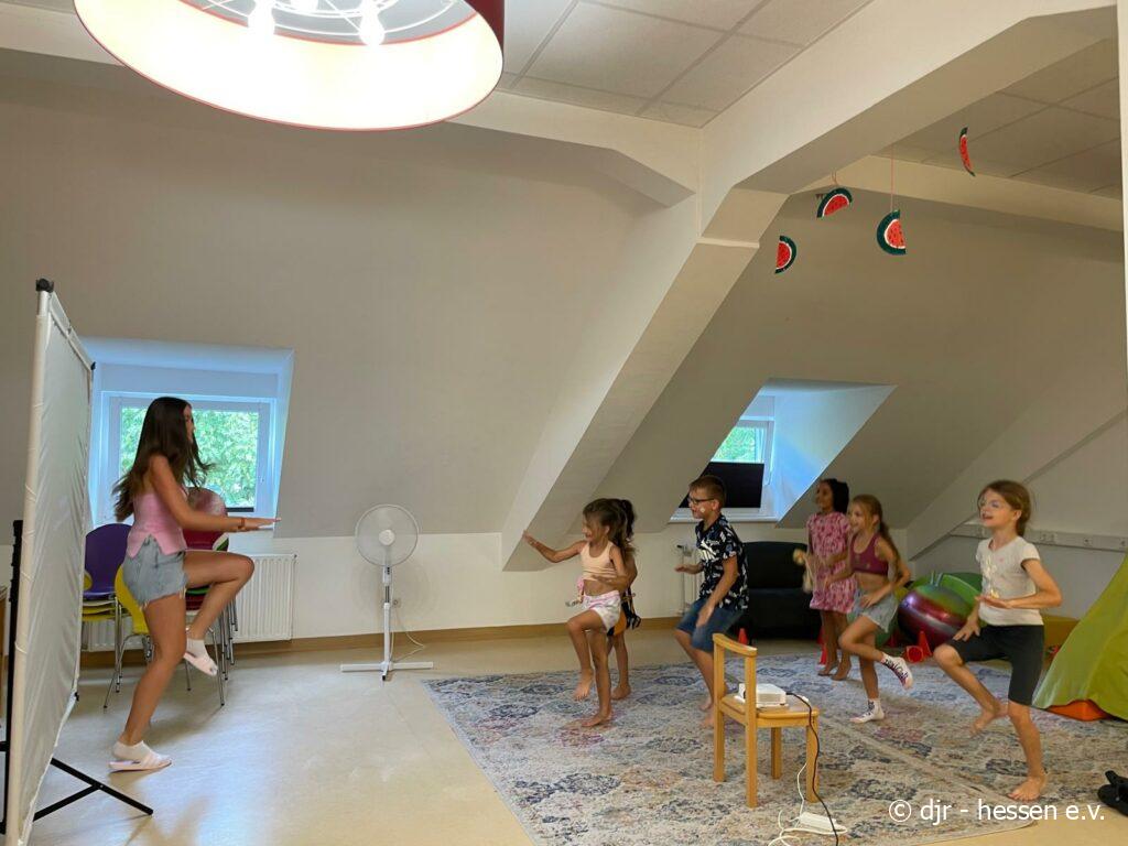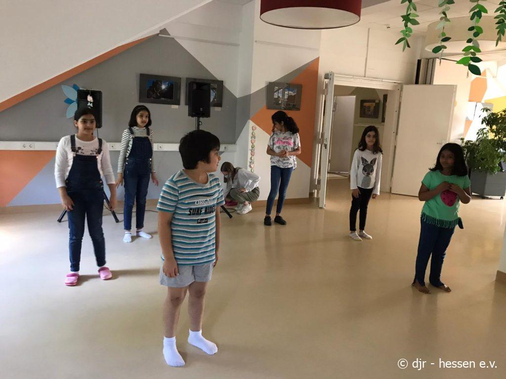 Die Kinder lernen heute gemeinsam Tänze! Nach einer Aufwärmrunde lernen die Kinder eine Choreographie, die sie anschließend gemeinsam vortanzen. Danach bekommen sie die Möglichkeit, in kleinen Gruppen eigene Tänze zur Musik zu erfinden und vorzustellen. Die Kinder bewegen sich und können ihrer Kreativität freien Lauf lassen.