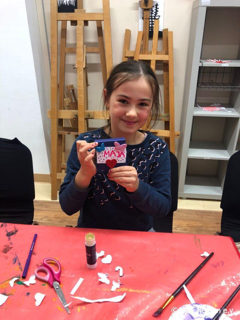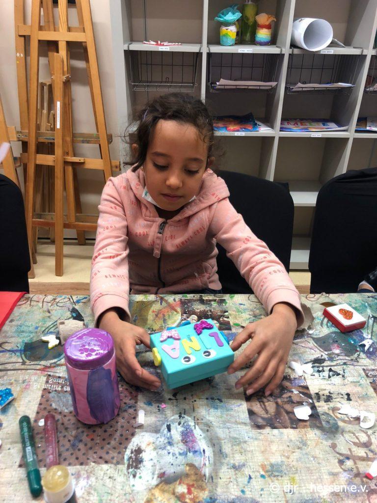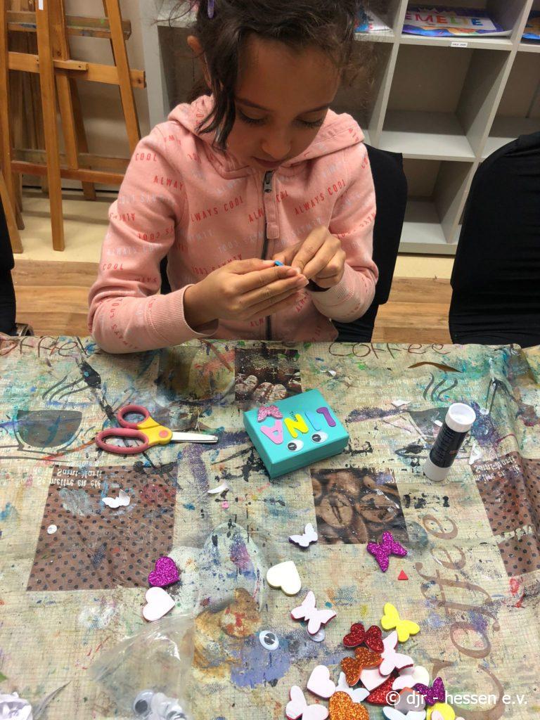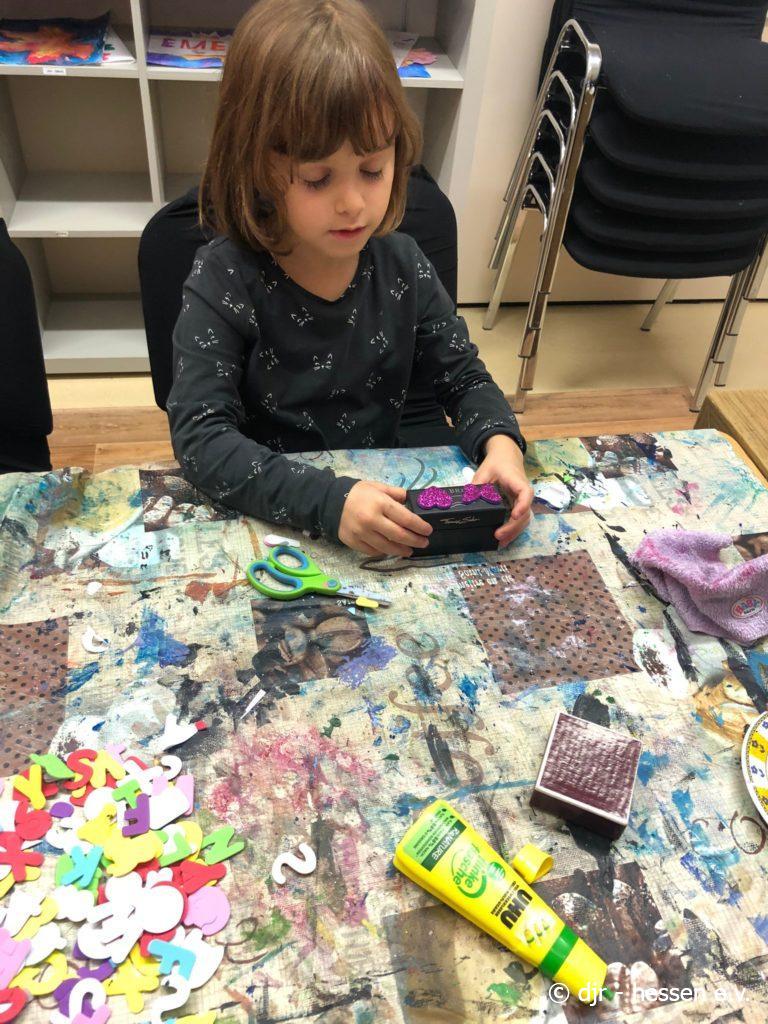Die Kinder haben aus alten Kisten und Material schöne Schmuckkästchen gebastelt. Jede hatte eigene Ideen und so sind alle Kästchen, die anfangs fast identisch aussahen, ganz einzigartig und verschieden geworden.