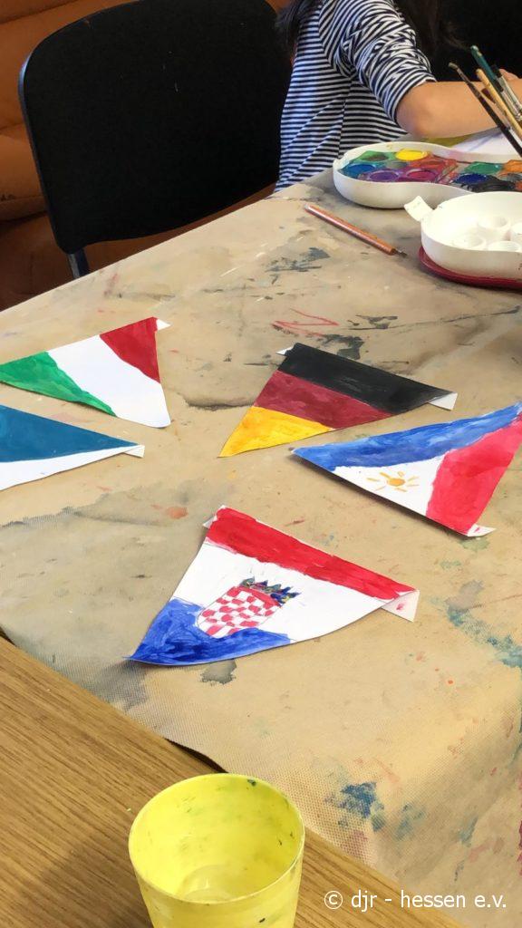 Heute haben wir darüber gesprochen, in welchem Land unsere Wurzeln liegen und gelernt, wie die Flaggen der einzelnen Länder aussehen. Jedes Kind hat die Flagge des Landes, aus dem es herkommt gemalt, sodass wir daraus eine schöne Girlande basteln konnten, die nun unsere Räumlichkeiten schmückt.
