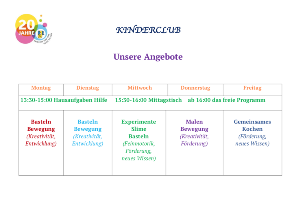 Unser Wochenprogramm variiert wöchentlich, je nach Thema der Woche bieten wir interessante und neue Angebote für die Kinder an. Permanente Angebote können Sie der Tabelle entnehmen, je nach Woche kann es zu leichten Abweichungen kommen.